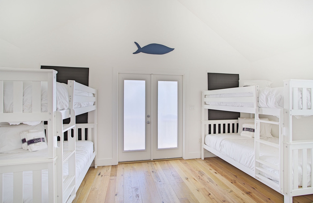 Second Floor: Queen Bedroom with Tub/Shower Combo, Two Full Bunk Room with Walk-In Shower and Laundry + Balcony Access.