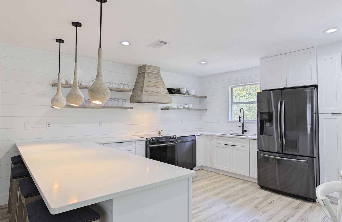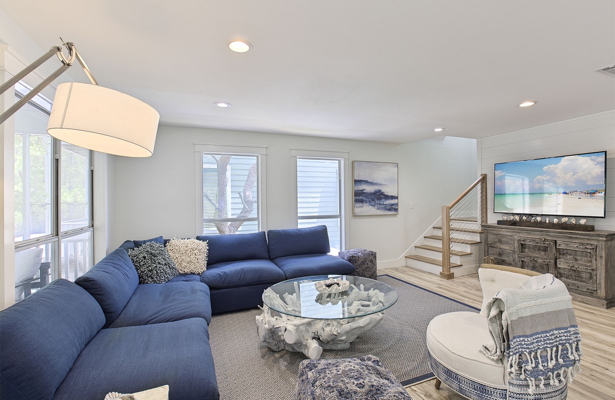 An open living area is located upstairs on the second level. The living room features a royal blue wraparound couch, driftwood and glass-topped coffee table, an accent chair, and a patterned ottoman. A flatscreen TV hangs above a rustic credenza for entertainment. Next to the living room is a state-of-the-art kitchen with gleaming countertops and brushed stainless-steel appliances. The kitchen offers plenty of room for cooking up vacation meals, serving appetizers, or mixing your favorite tropical cocktails. A large breakfast bar sits below modern light fixtures and includes raised seating for four. Enjoy a delicious dinner at the glass-topped dining table, which sits between the kitchen and a set of glass windows. From this main living area, guests can access a wraparound porch that boasts an outdoor table, chairs, and a porch swing. The second level also features two guest bedrooms: one has a queen-size bed, and the other has two full beds.