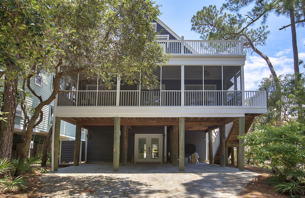 Live oaks and coastal plants greet vacationers upon arrival, providing a protective and private setting for this sought-after beach home. Enter the glass doors on the first level, where a spacious guest room features a king-size bed, access to a full hall bath with shower and soaking tub, and a washer and dryer. This level opens out onto a backyard sundeck. The deck boasts a private pool surrounded by patio furniture and lounge chairs, offering a relaxing environment for an afternoon swim or evening nap.