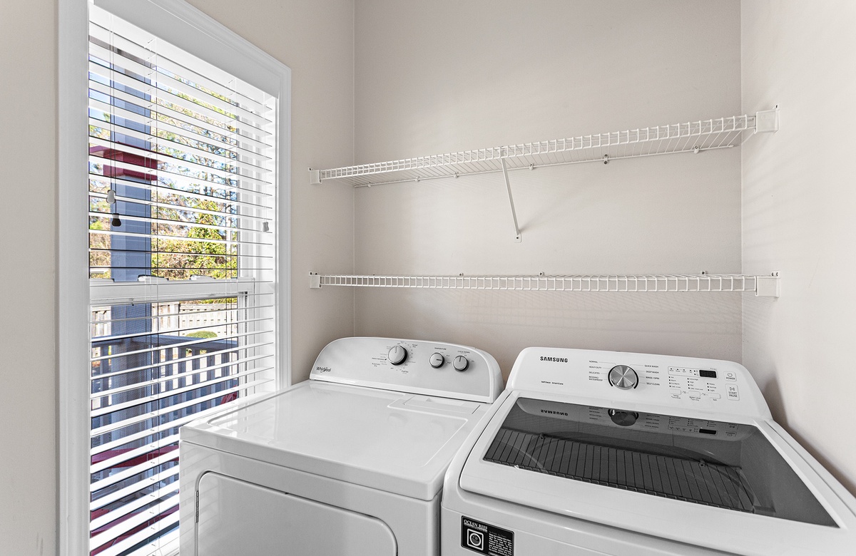 First Floor: Living Room with Queen Sleeper Sofa, Kitchen, Dining Room, Powder Room, Laundry.