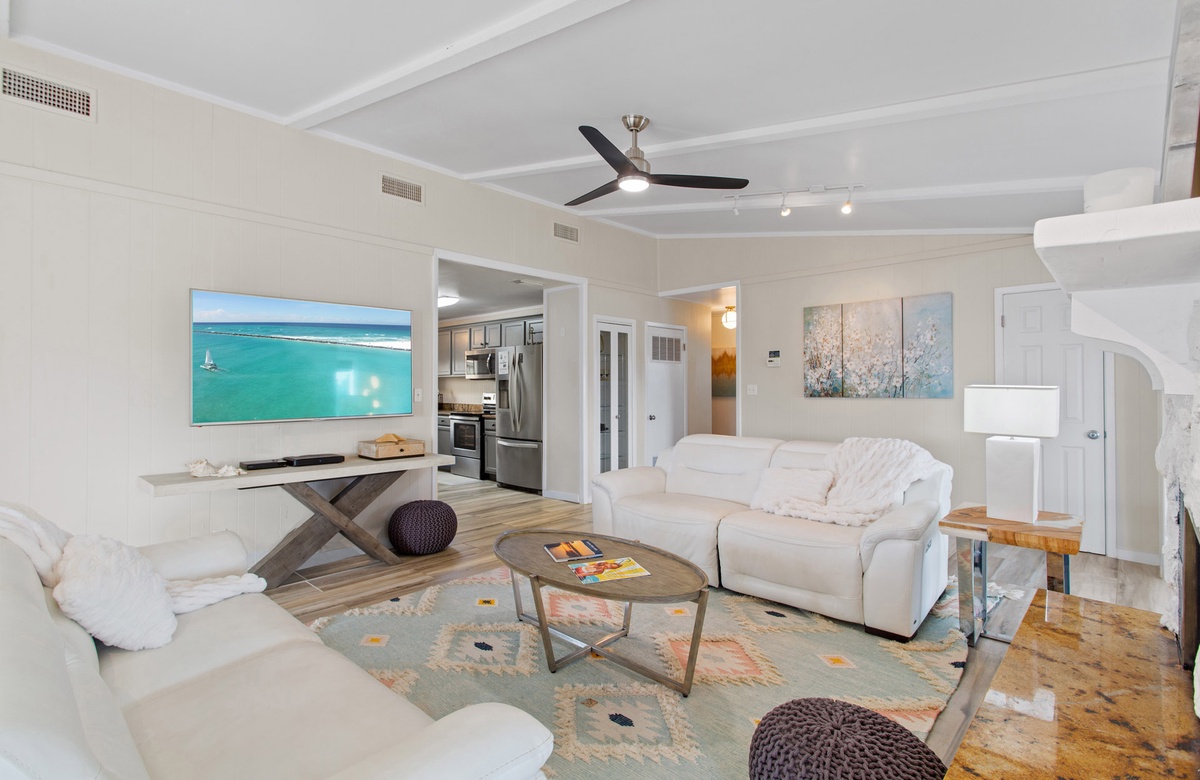 Inside, the home’s living room is warm and inviting. Shiplap walls, light-toned flooring, and coastal-inspired accents add to the beachy feel. The living room includes two white leather couches and a wooden drink table. A wall-mounted flatscreen TV is provided for entertainment. In the dining room, a honey-toned wood table is surrounded by six high-backed chairs. A set of glass doors leads to the breezy balcony. The spacious kitchen has granite countertops, custom cabinetry, stainless steel appliances, and a sunny window for natural light.