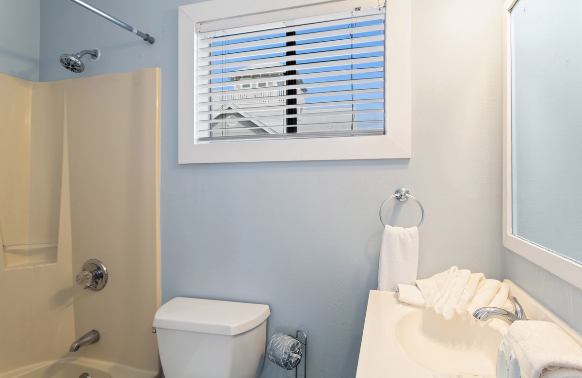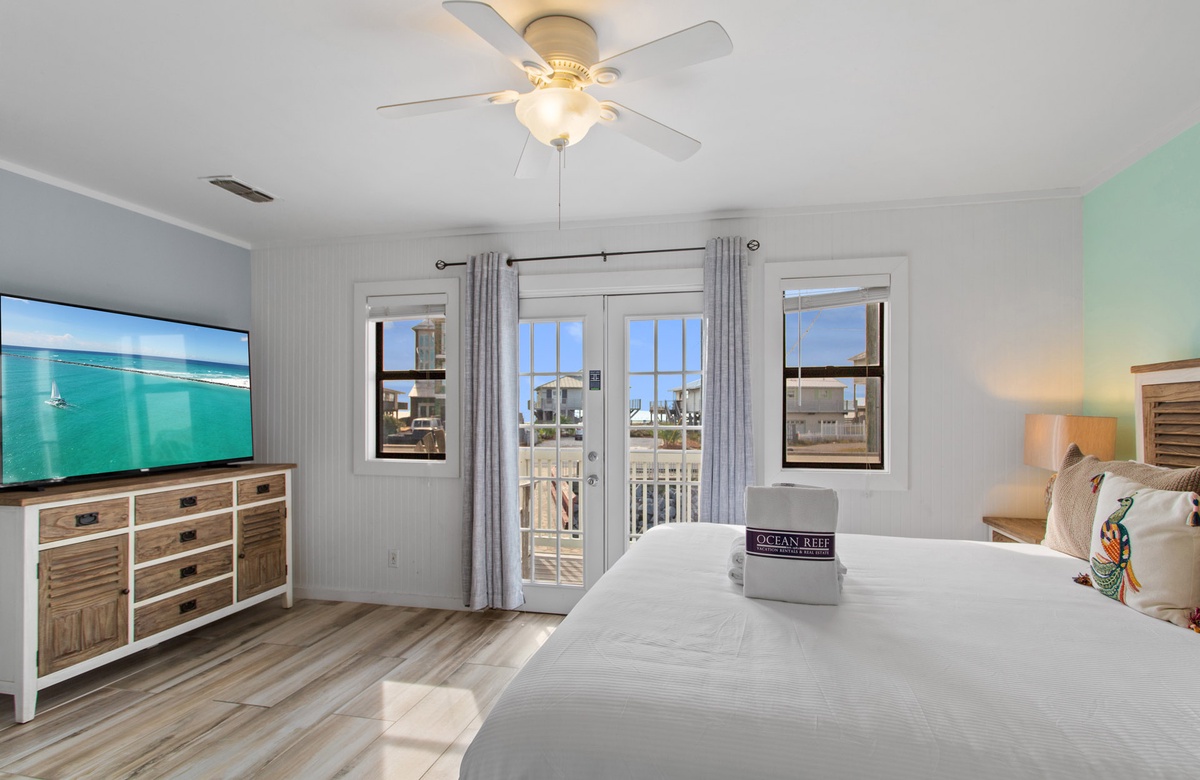 The primary suite features a king-size bed, huge flatscreen TV, balcony access, and an ensuite bath with a tub/shower combo. Two of the remaining guest rooms also have king-size beds, so there is no need to fight over sleeping accommodations! Each of these bedrooms also has a TV and shares a full hall bath. The final guest bedroom includes two twin bunks, perfect for the kiddos.
