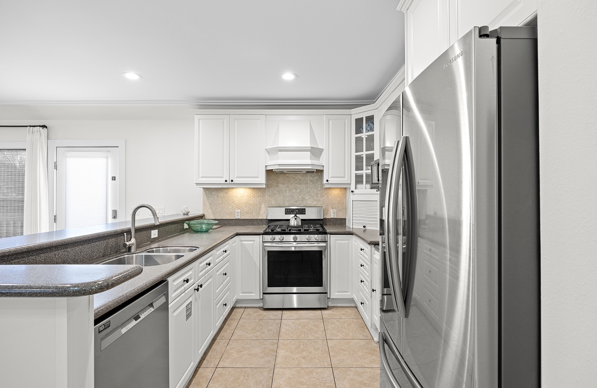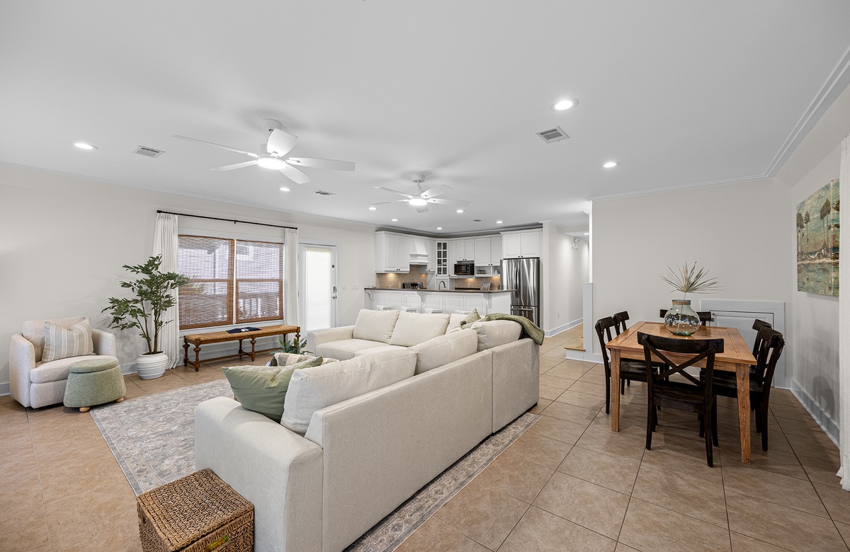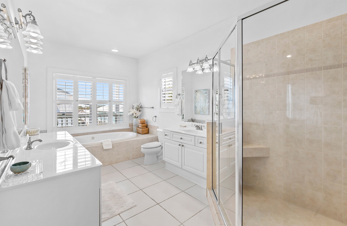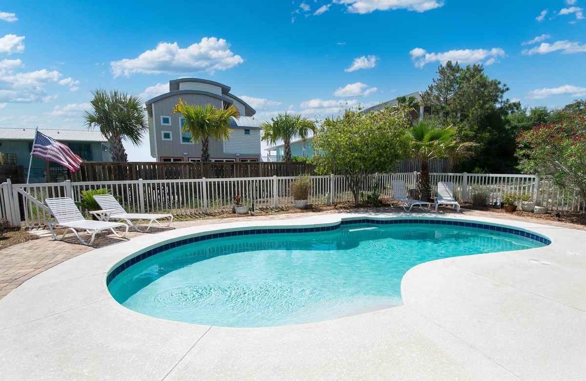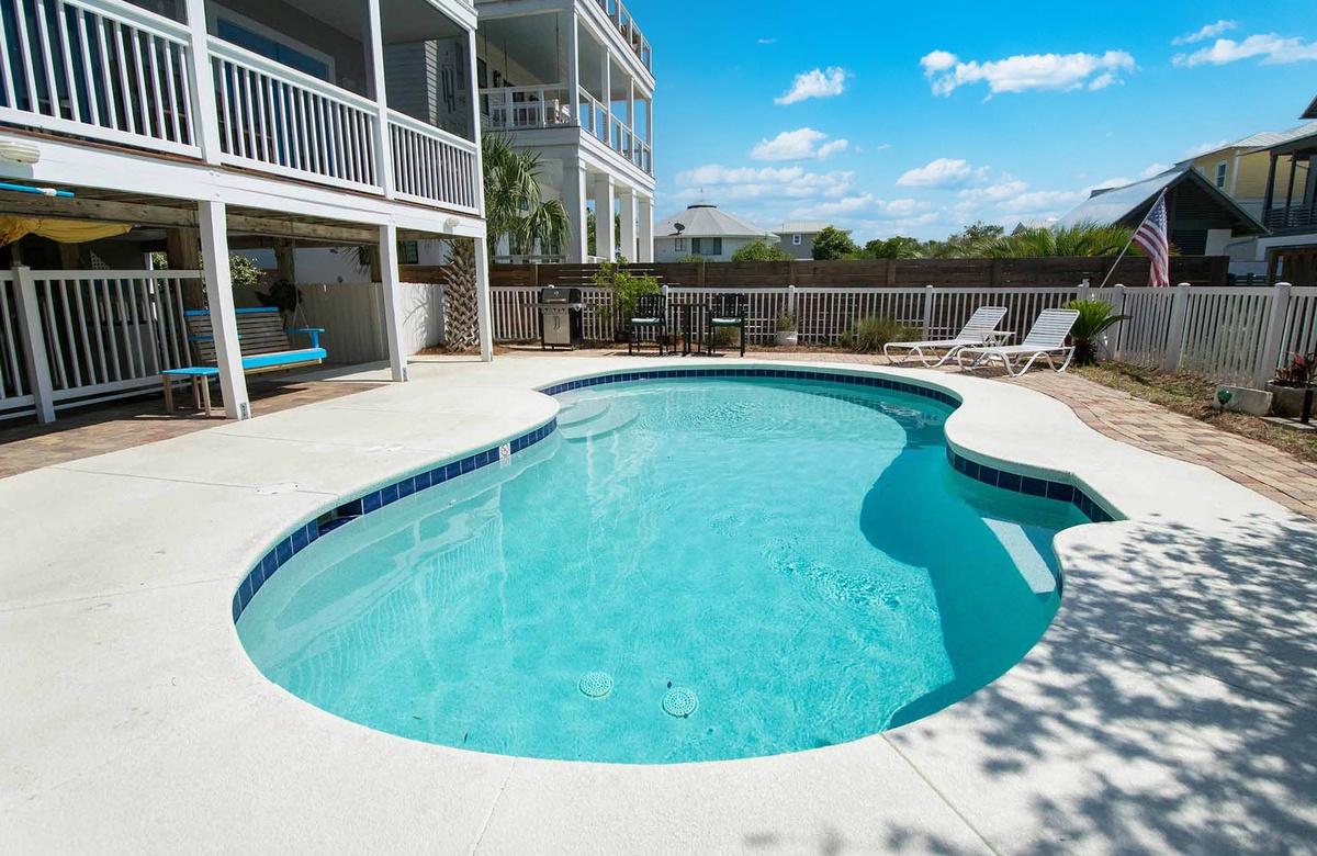 The main level welcomes you to an open floor plan with a spacious living room boasting windows and doors that let in abundant natural light. The kitchen features everything the home chef will need to whip up meals for the whole group including stainless steel appliances, a 6-burner gas range and dual oven, a breakfast bar and pantry. The main level has 3 bedrooms and 2 bathrooms - 1 King bedroom, 1 Queen bedroom and one bedroom with two Full beds. On the third level you can find a spacious Master bedroom with a King bed, private bathroom that has a large walk in shower, jetted garden tub, and dual vanities. The master bedroom also has a Queen sofa sleeper and a large walk in closet. Off of the Master bedroom you can enjoy partial gulf-views from the covered balcony. Sand Dollar’s lower level offers a large private pool, plenty of pool and patio furniture, and a covered terrace with room to eat and play. Make use of the convenient half pool bath house and outdoor shower before heading back in after a day in the sun.