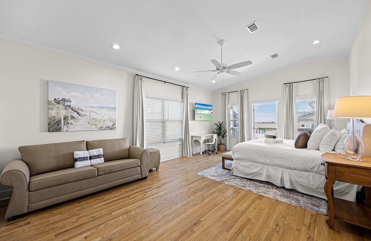 - Master suite with King bed, Plush Queen sofa sleeper, TV, large private bath, tub and shower, balcony, Keurig coffee station