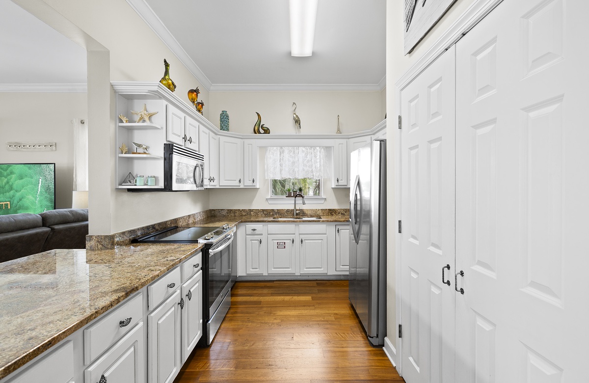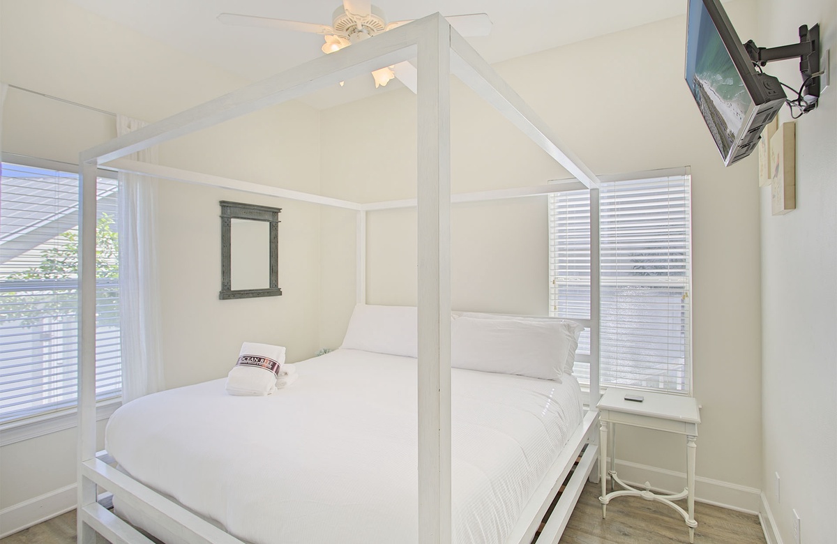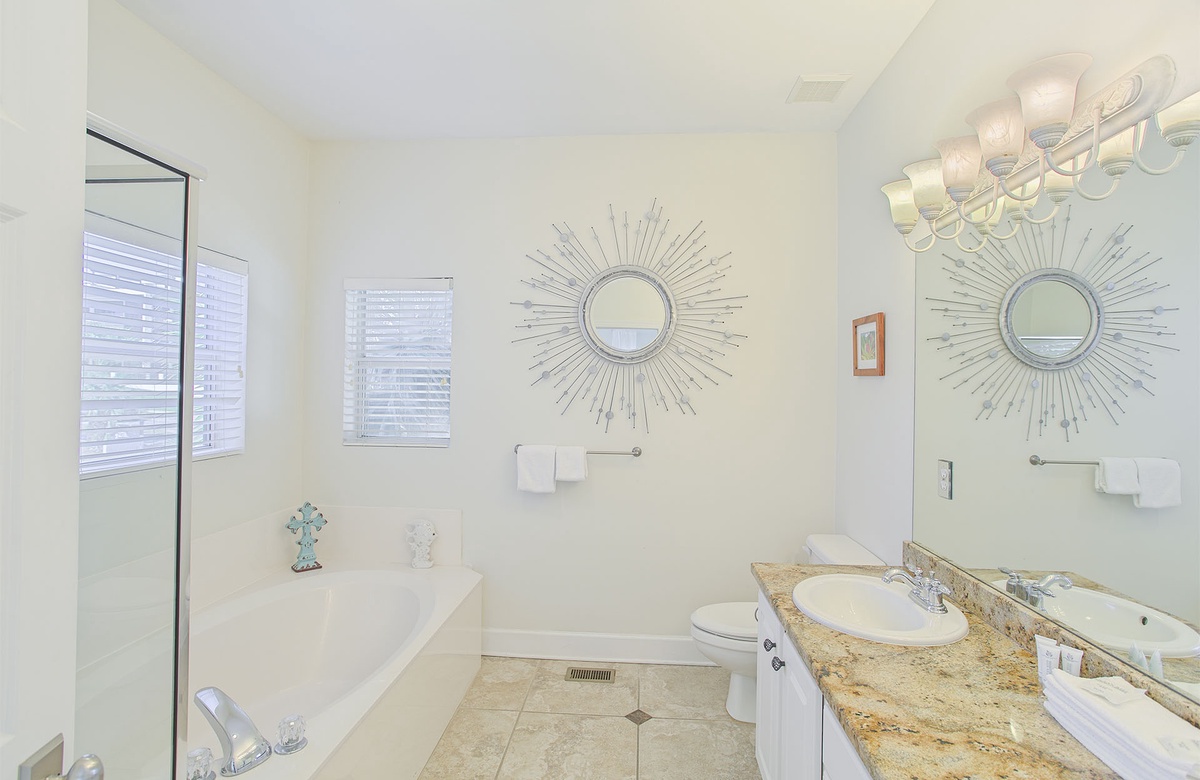 Sandy by the sea has 4 bedrooms and 2 baths, and boasts plenty of sunlight through its many windows and open floor plan. On the first floor, you have a large living room with three couches and two sitting chairs. A beautiful kitchen with stainless steel appliances and granite counter tops, a breakfast bar that seats two and a separate dining room that seats six. There are two guest bedrooms on this floor as well, one with a queen bed and one with a king bed, a full hall bathroom, and a laundry room. There is a wrap around front porch to enjoy the gentle sea breeze. The second floor has a king master bedroom unto itself. The master bedroom has a full bathroom with a separate shower and garden tub, and screened in porch accessible by french doors. There is an outdoor balcony located off the screened porch. On the third floor there are two full-sized beds. A perfect bedroom for the kids to relax and watch TV or a movie.
