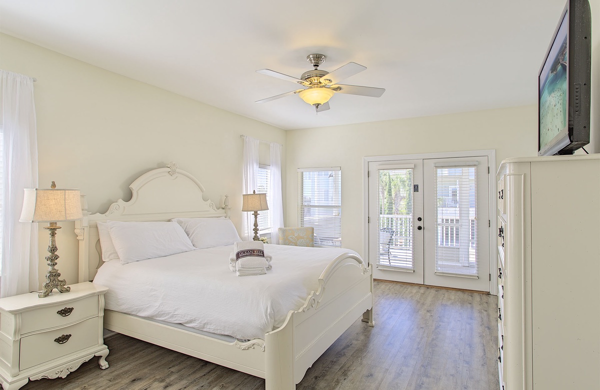 Second Floor: King Master Bedroom with Full Sleeper Sofa and Walk-In Shower + Soaking Tub and Balcony Access.