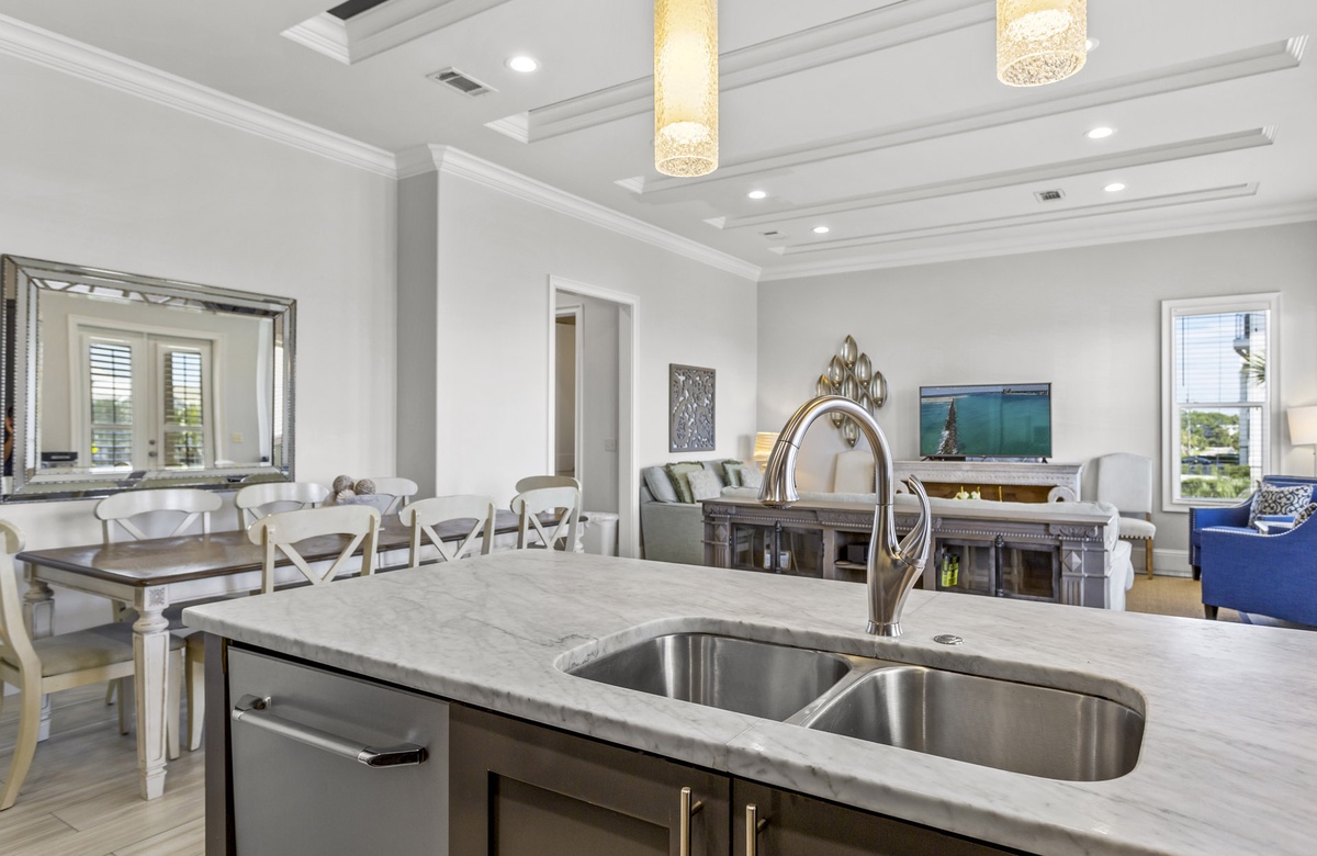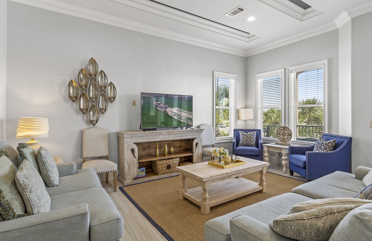 The second floor opens into an open living/kitchen area. Looking out over the gulf and lush landscaping from the balcony, you'll take in views of the swimming pool below. Slide down the spiral staircase to the patio if you are so inclined, but why would you want to leave this gorgeous room? High ceilings, hardwood tile floors, and ample chairs and couches make it the perfect place to relax. Navy blue cabinets and a decidedly marine theme in the kitchen make it the perfect place to prepare your seafood feast. There's a cute guest room on this floor as well, with a king-size bed and an ensuite bath to boot!