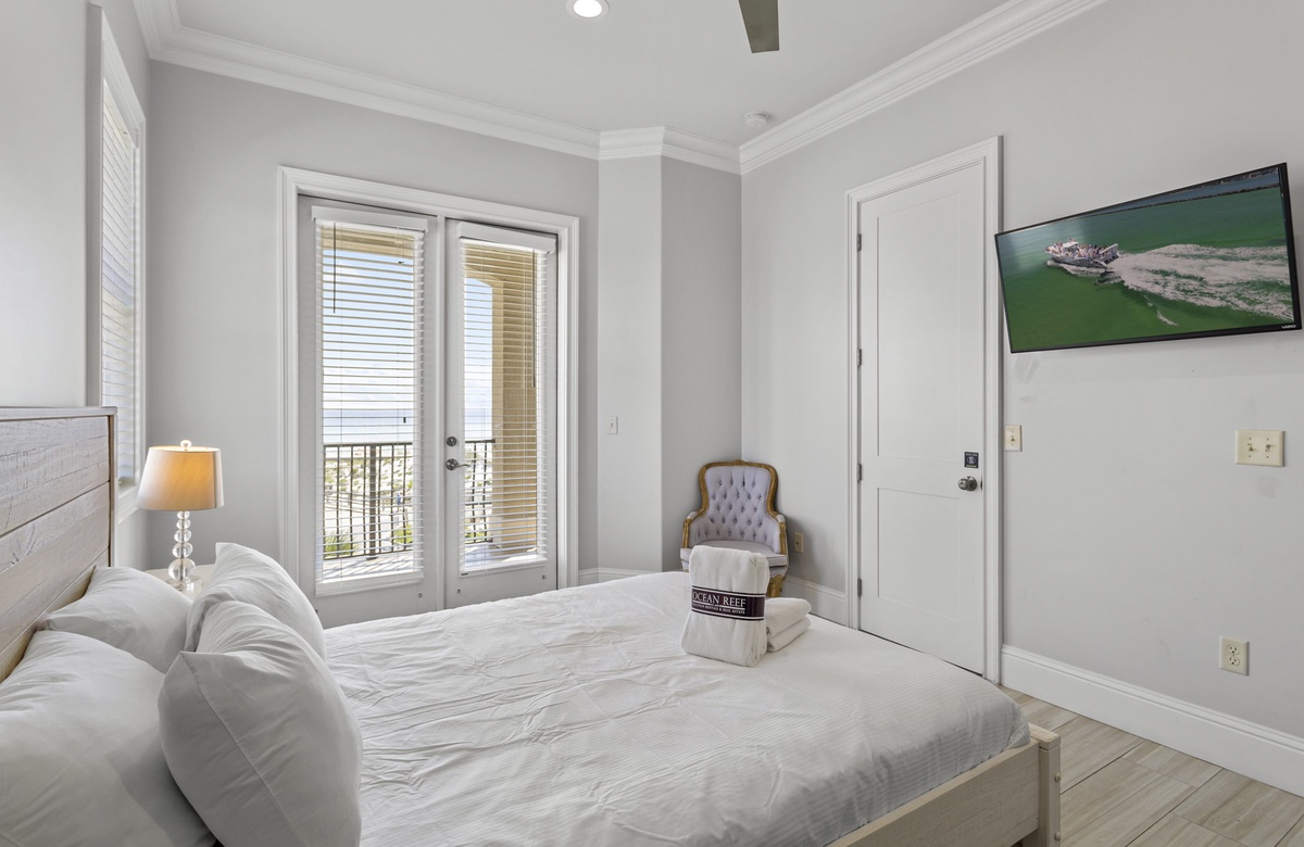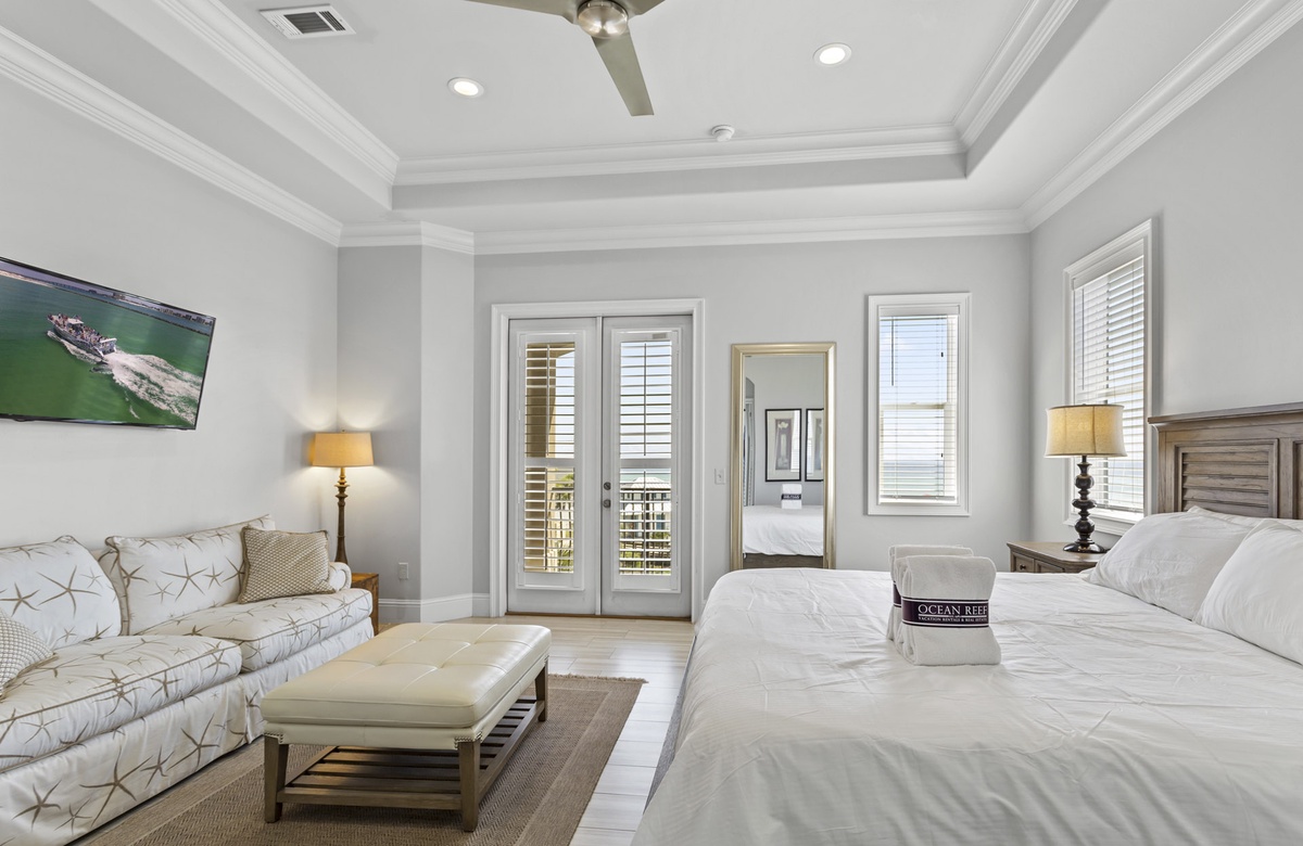 Head up to the third floor to find the master suite and guest bedroom, sharing the large porch on this level, looking out over the dunes to the emerald green waters. The master includes a large king bed, two raised vanity sinks, lots of dressers and closets to stash your latest souvenirs, and a casual sitting area.