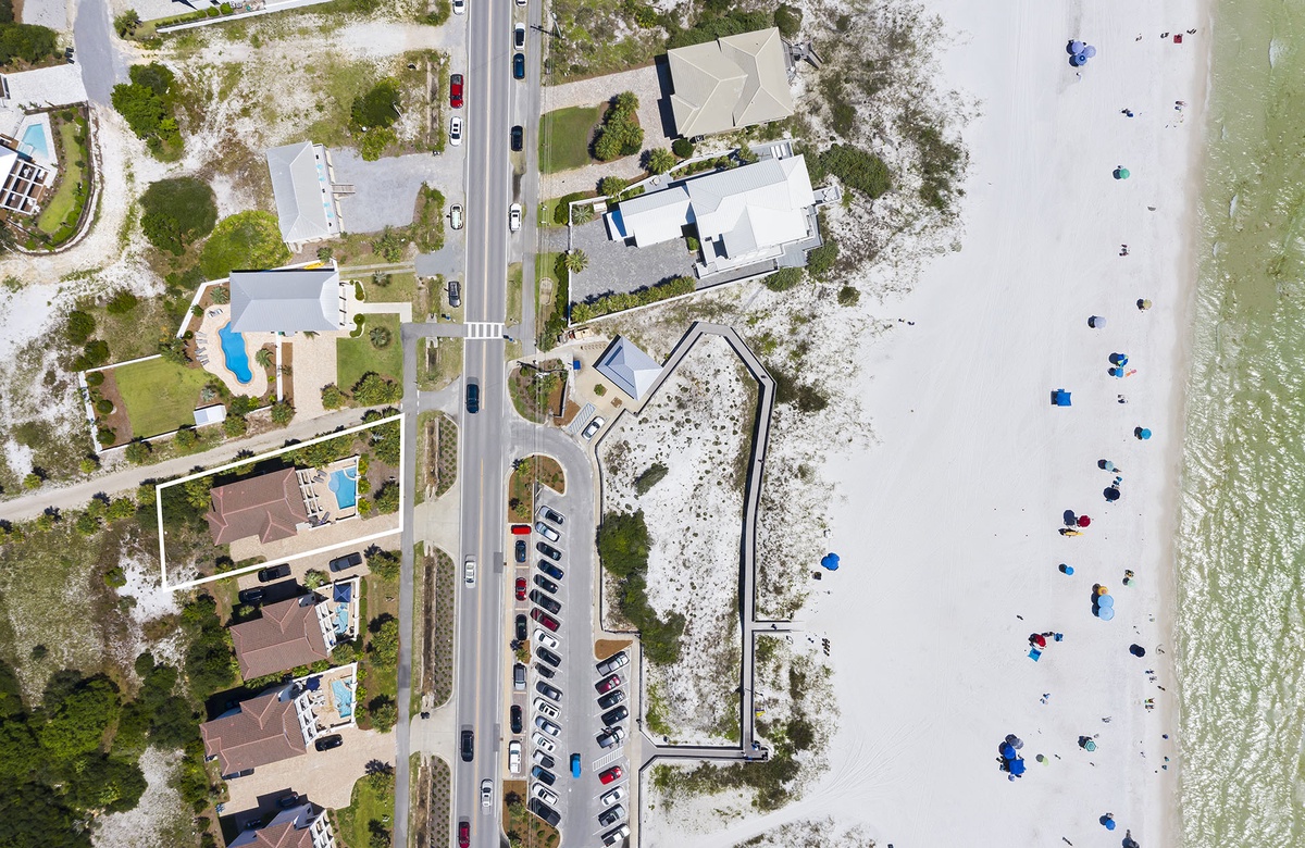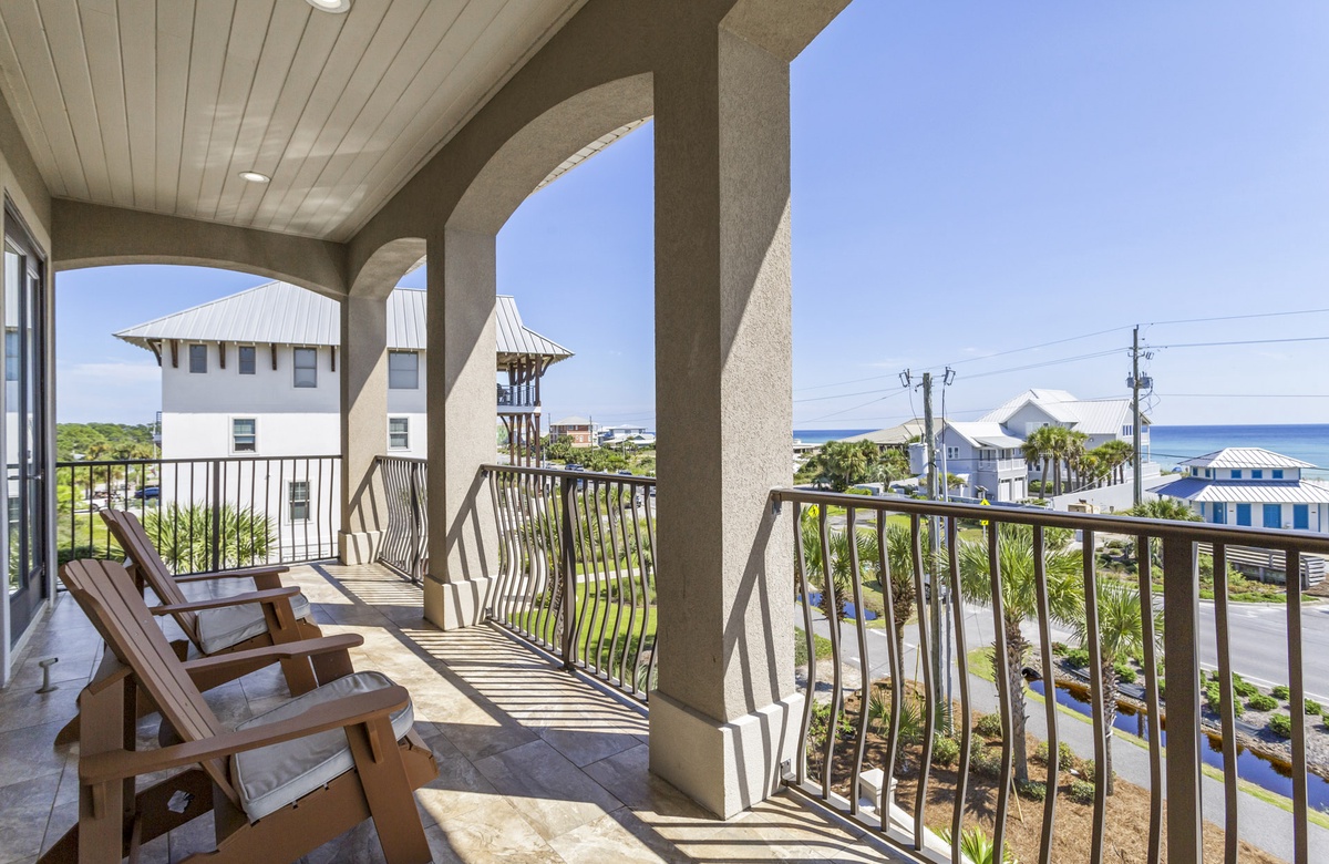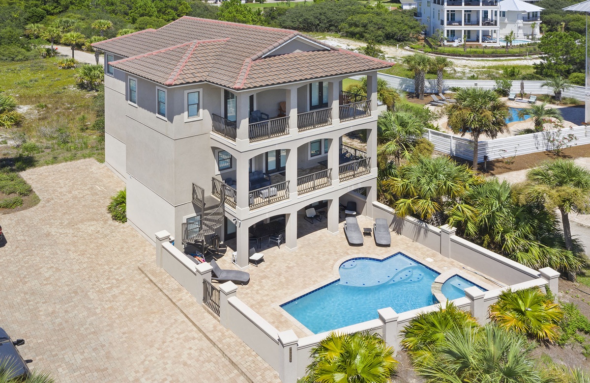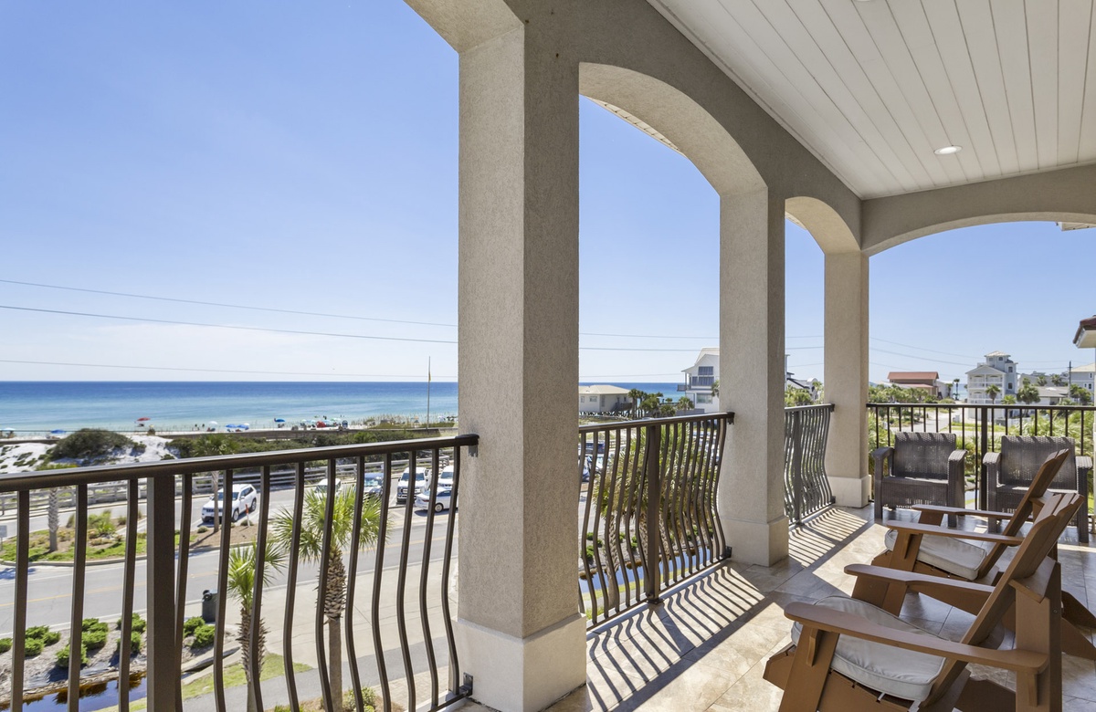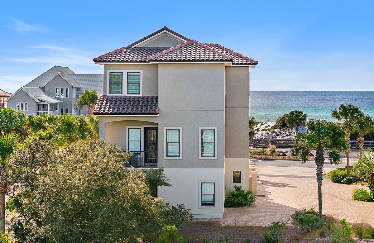 When you approach this home, you will first notice its incredible street presence. Rising three stories tall, Sea Vue presents like a massive European coastal villa. Sitting directly across from the Dune Allen beach access further solidifies its position as one of the premier locations on the western end of 30A. The specs are a bit staggering as well! Large enough to sleep 14 guests, it features five spacious bedrooms, six and a half bathrooms, a private pool with a spillover tub, and large porches on every level.