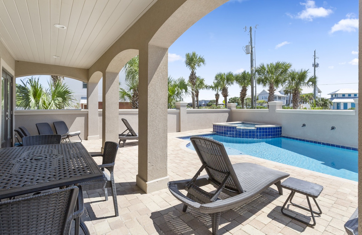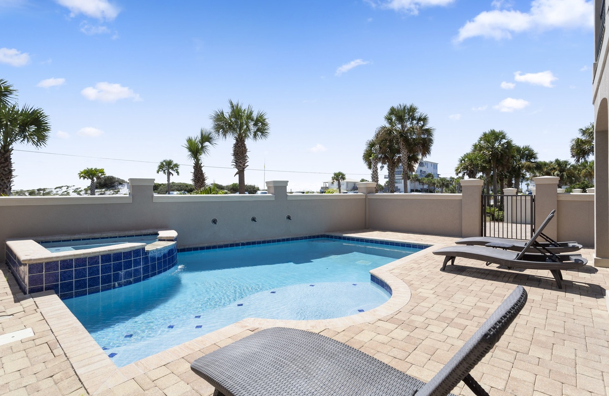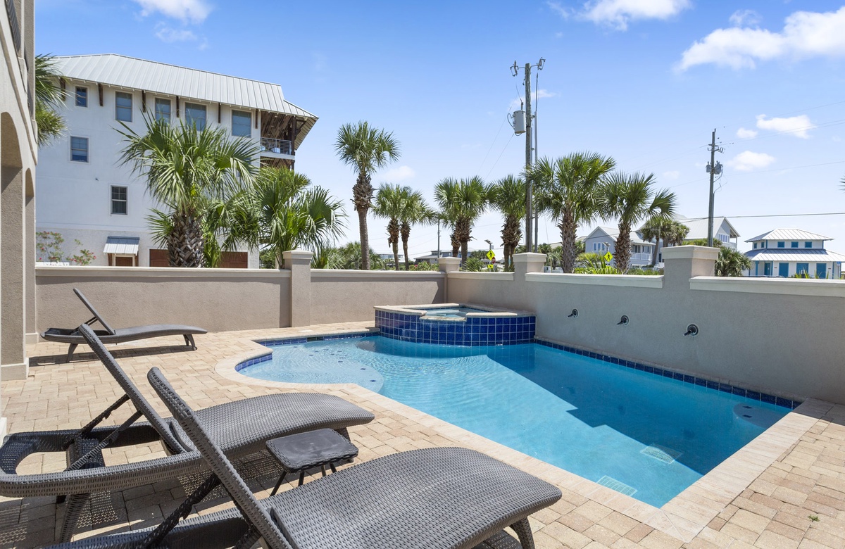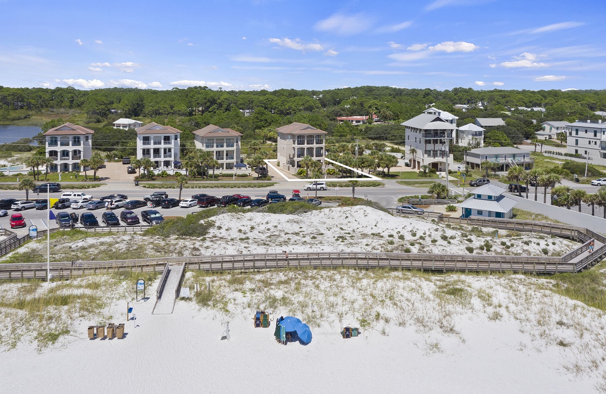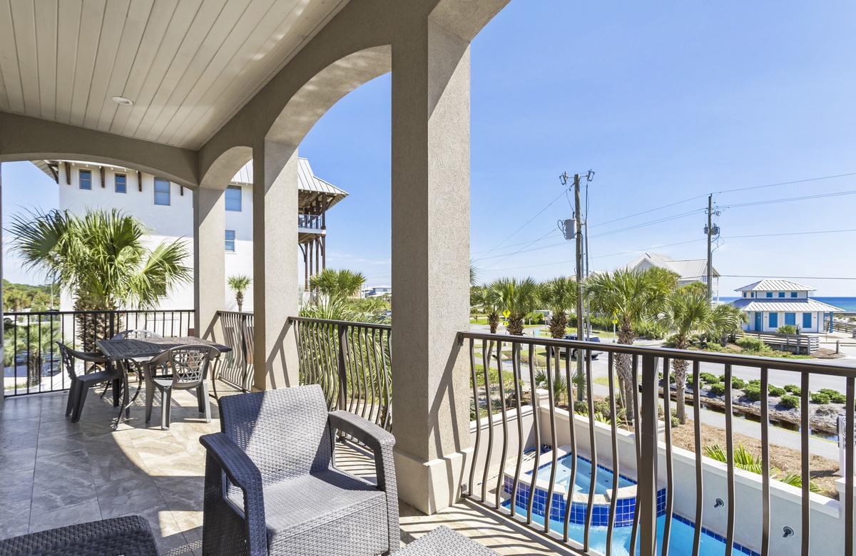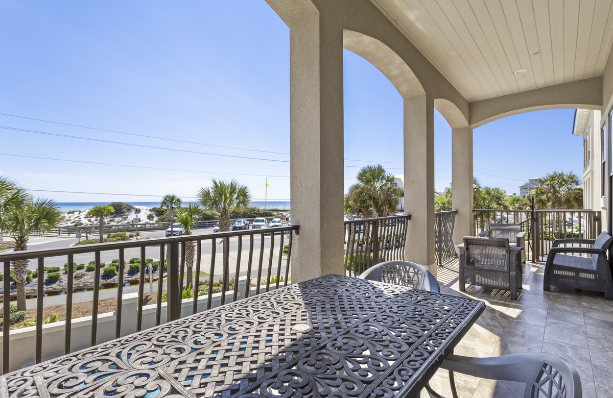 When you approach this home, you will first notice its incredible street presence. Rising three stories tall, Sea Vue presents like a massive European coastal villa. Sitting directly across from the Dune Allen beach access further solidifies its position as one of the premier locations on the western end of 30A. The specs are a bit staggering as well! Large enough to sleep 14 guests, it features five spacious bedrooms, six and a half bathrooms, a private pool with a spillover tub, and large porches on every level.
