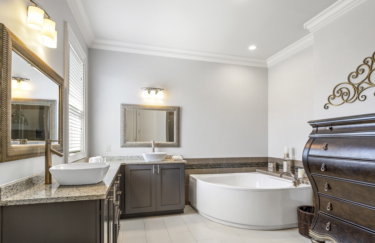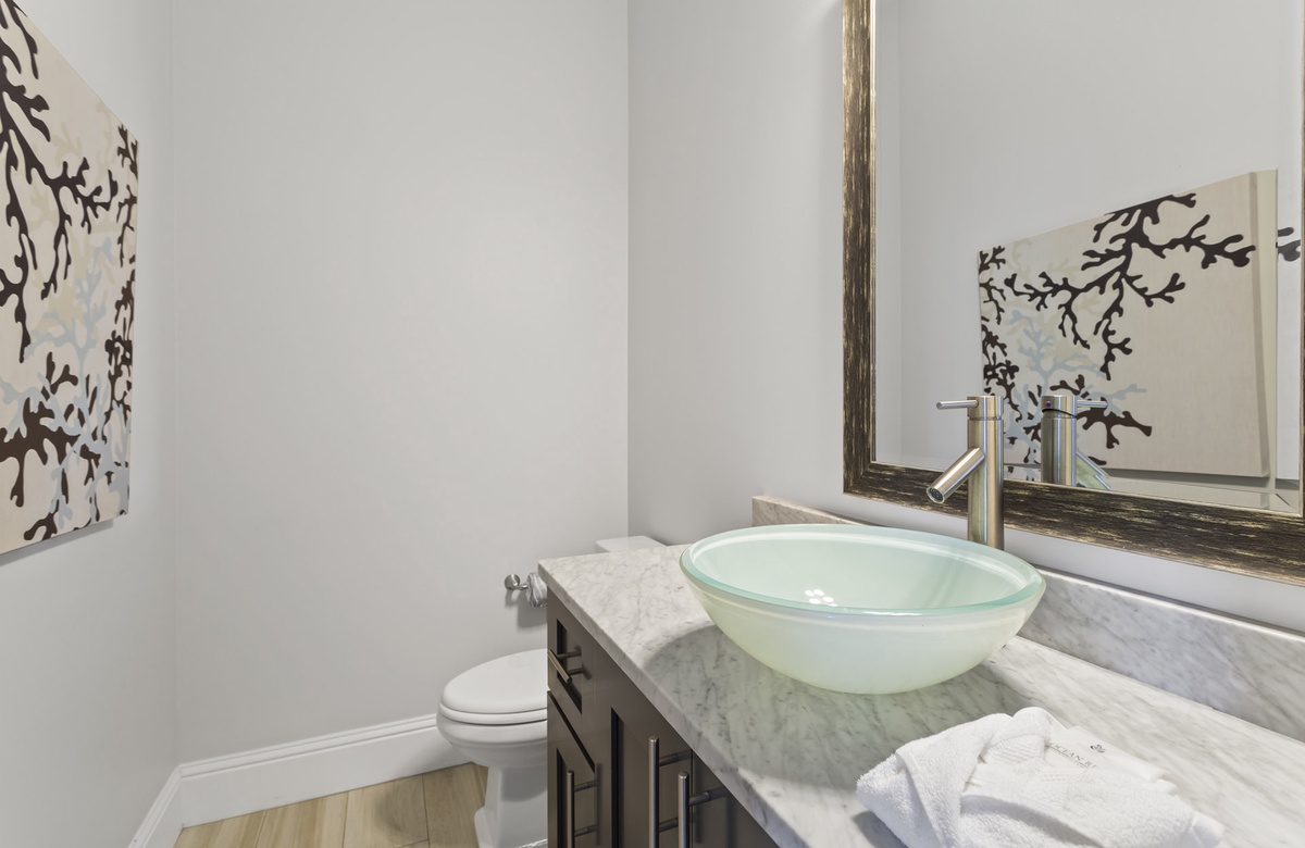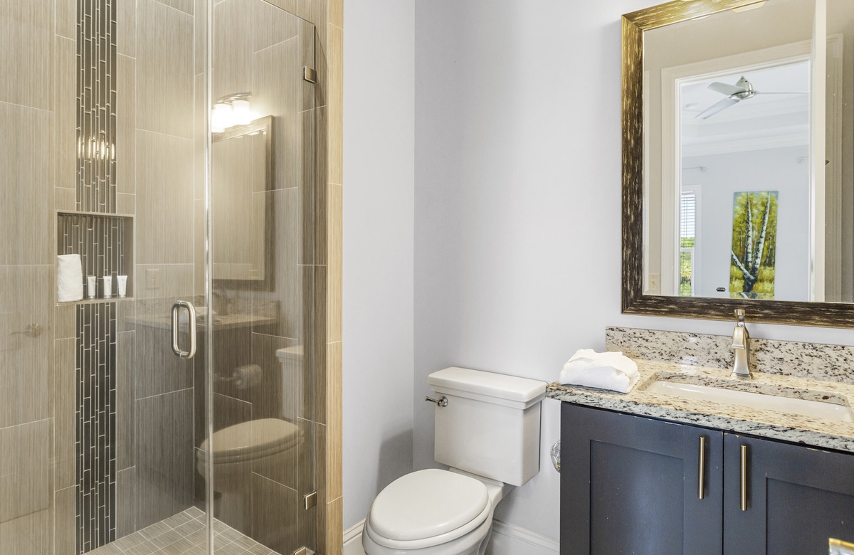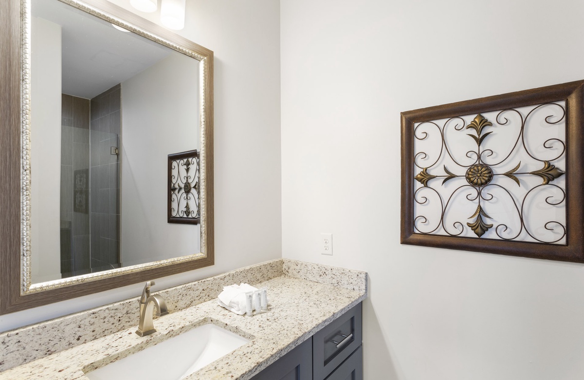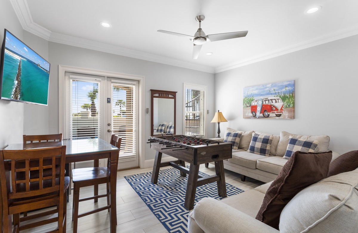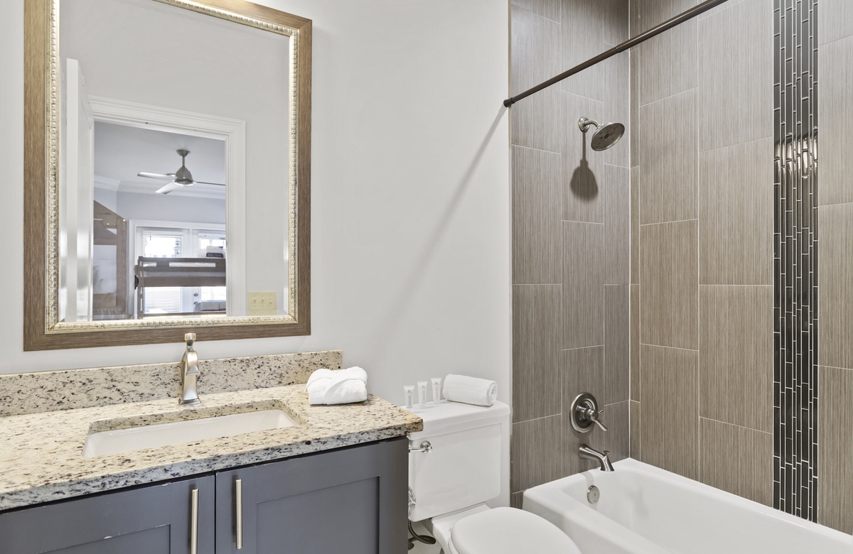 Guests will enjoy a foosball table in the game room and two guest bedrooms on the first level. Hanging out in the game room is casual and laidback with a giant flatscreen TV for watching the game, a comfy couch and chairs, a wine cooler, and access to a shared full bath. The queen guest bedroom closest to it boasts an ensuite bath with a walk-in shower. Just across the hall, you'll enjoy the custom bunk room that sleeps 6 and yet another ensuite bathroom with a tub-shower combo.