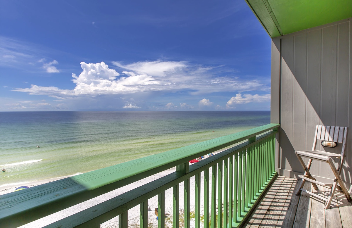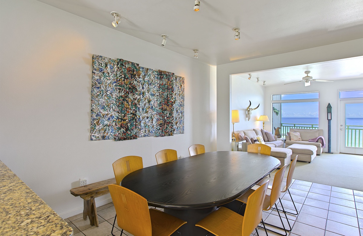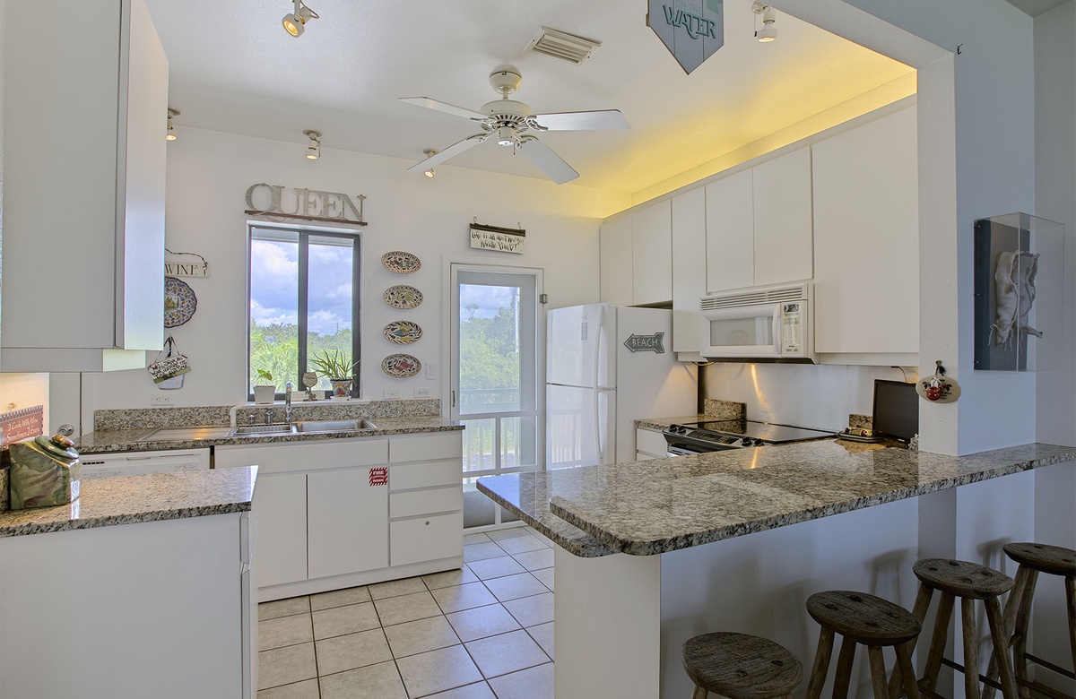 Your picture-perfect coastal vacation starts the minute you step into the open living area, which features a large window and sliding glass balcony doors. From the balcony, you can enjoy a tropical drink of your choice and take in the glistening panorama of the seascape. In the living area, the comfortable seating arrangement faces Gulf views and a wall-mounted TV for entertainment, and the wraparound couch doubles as a queen-size sleeper sofa. The open floor plan continues to the dining area, which features an oval-topped table with seating for eight. The kitchen’s granite-topped bar also includes seating for four.