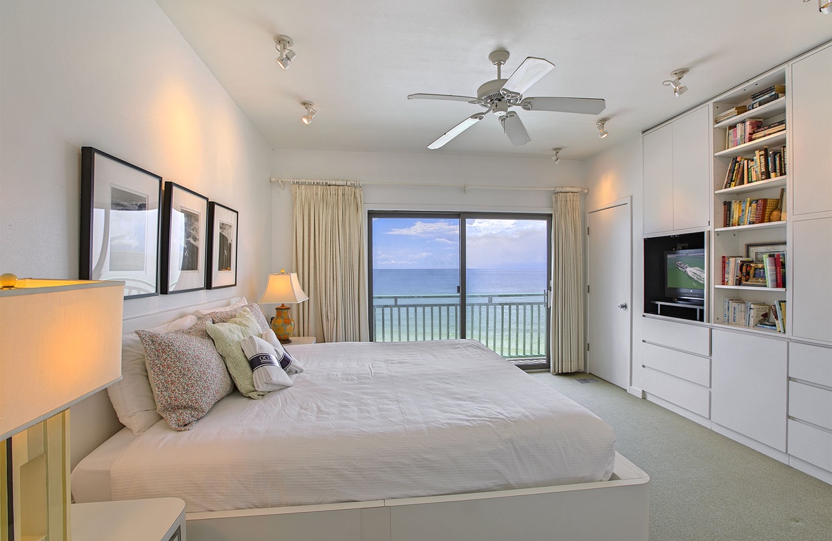 The master bedroom boasts a king-size bed, full en-suite bath, and doors opening to a private balcony with spectacular views. Imagine waking up and watching the sun glistening over the Gulf…all from the privacy of your own bed! An additional guest bedroom includes a king-size bed, en-suite bath, TV, and balcony.
