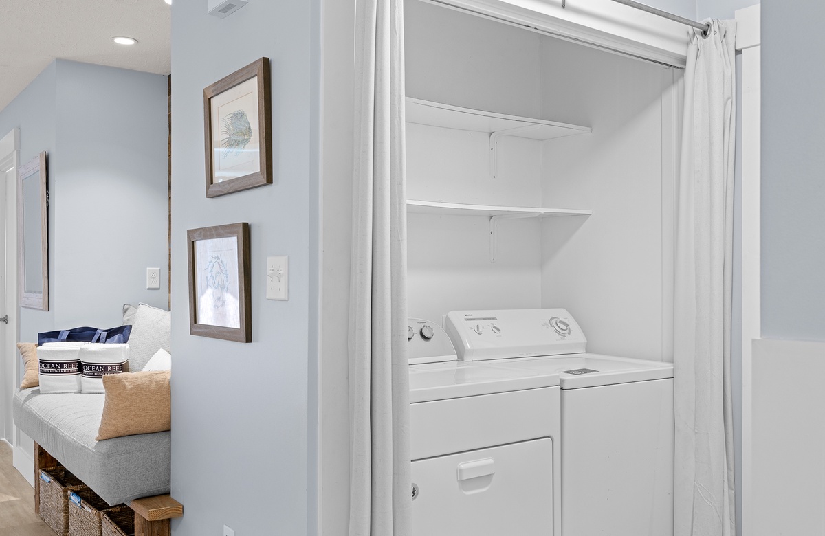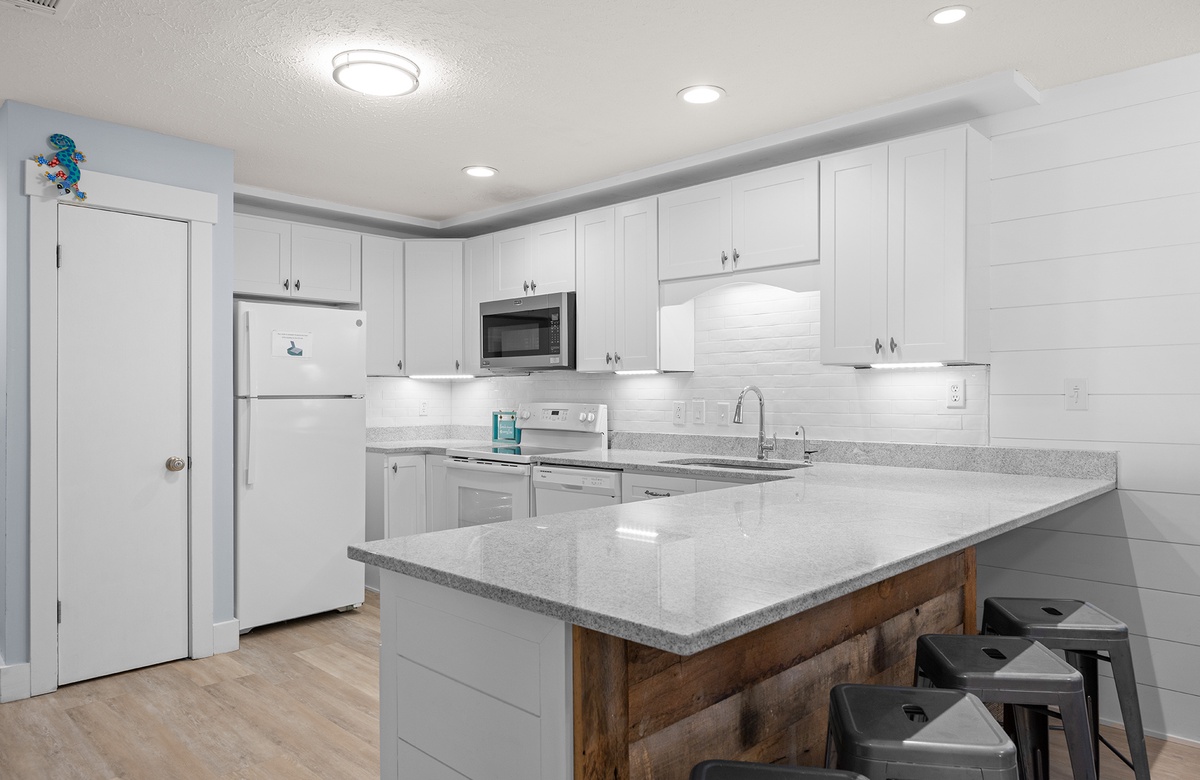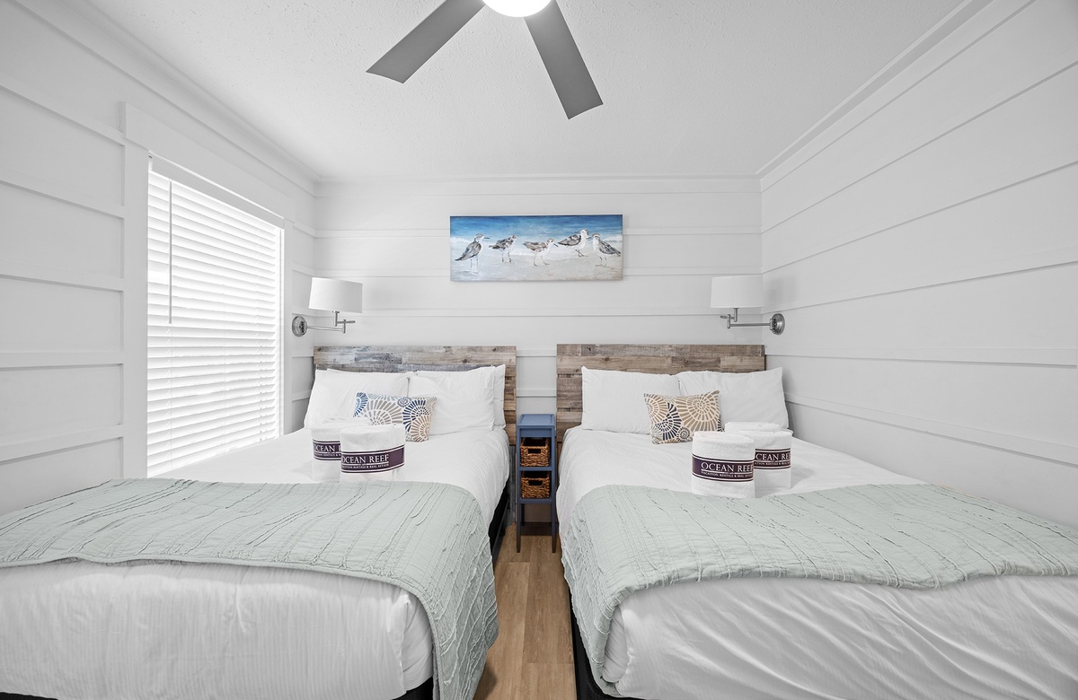 All One Level: Living Room with Full Daybed and Queen Sleeper Sofa + Balcony Access, Kitchen, Dining, King Bedroom with Walk-In Shower and Balcony Access, Bedroom with Two Full Beds and Tub/Shower Combo, Laundry.