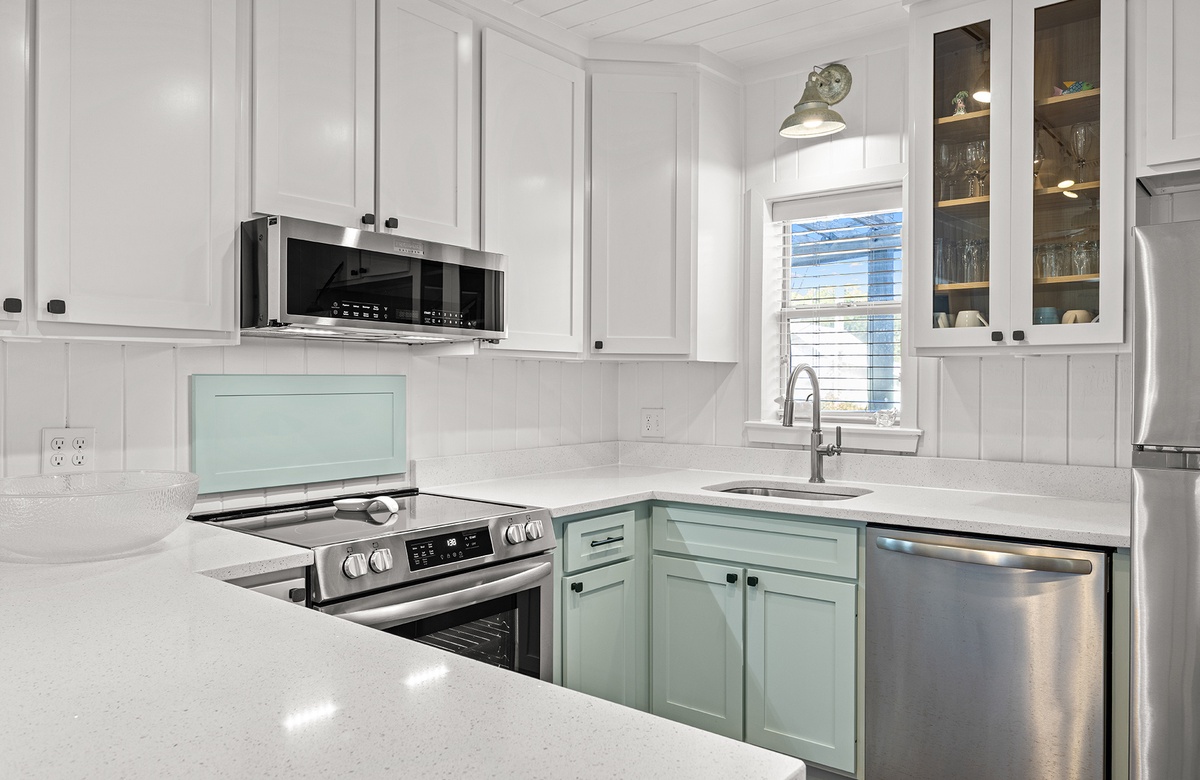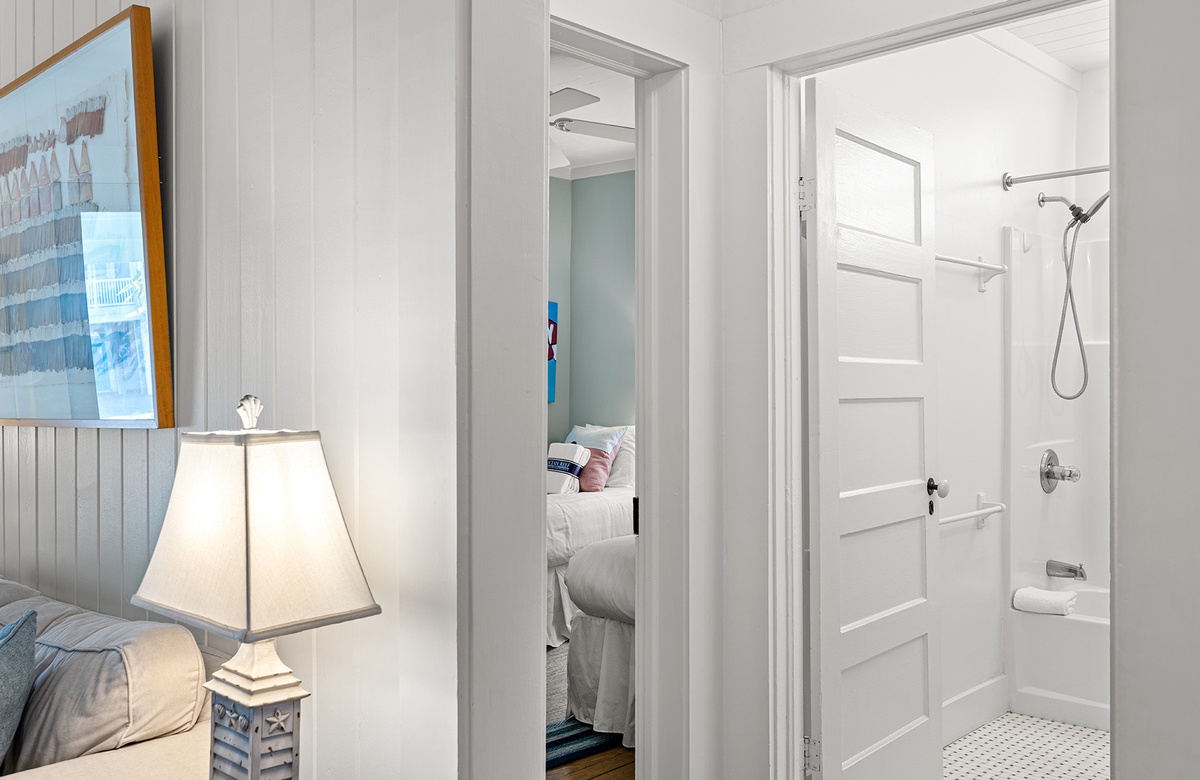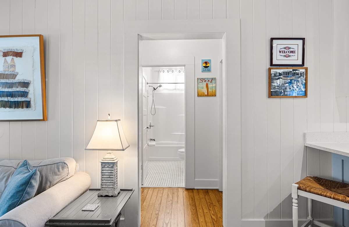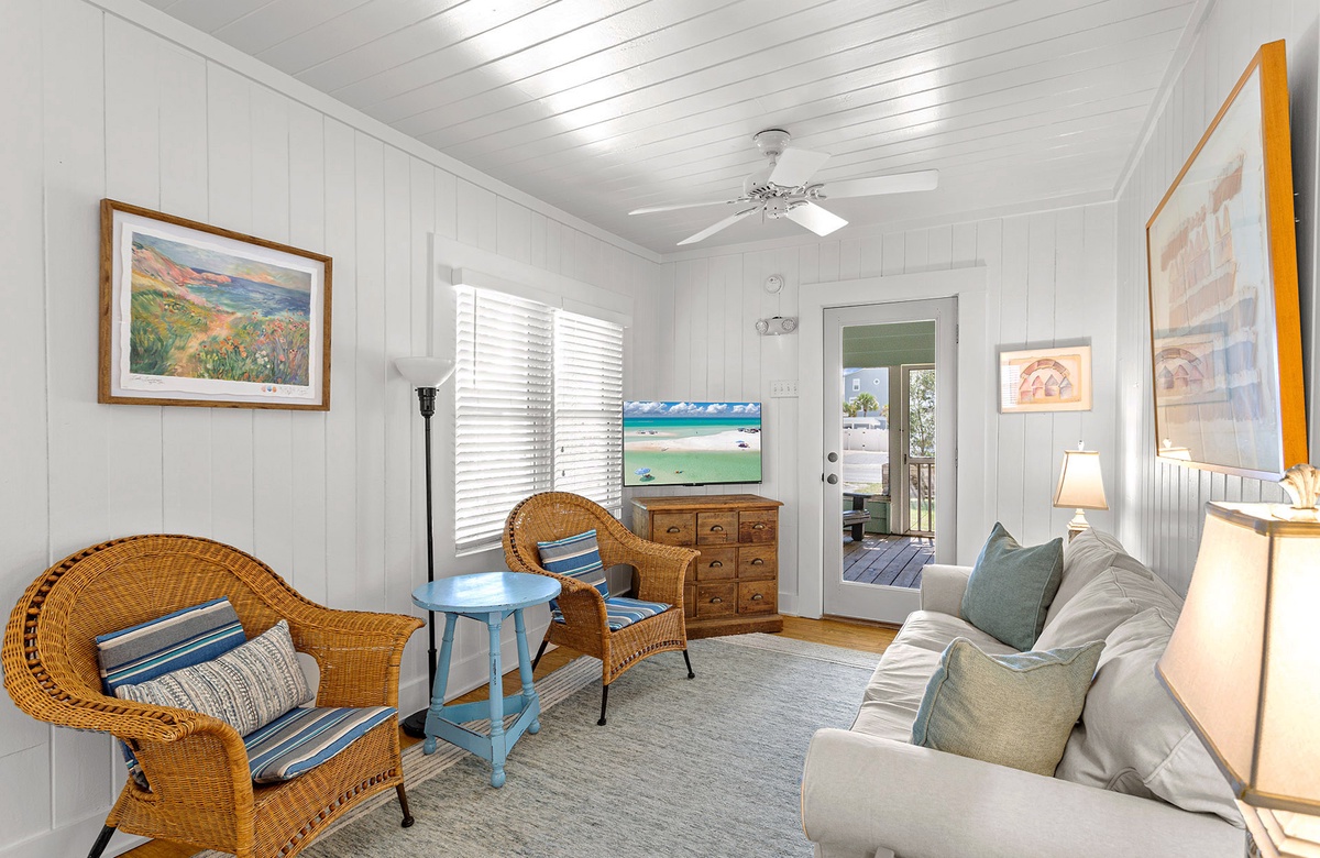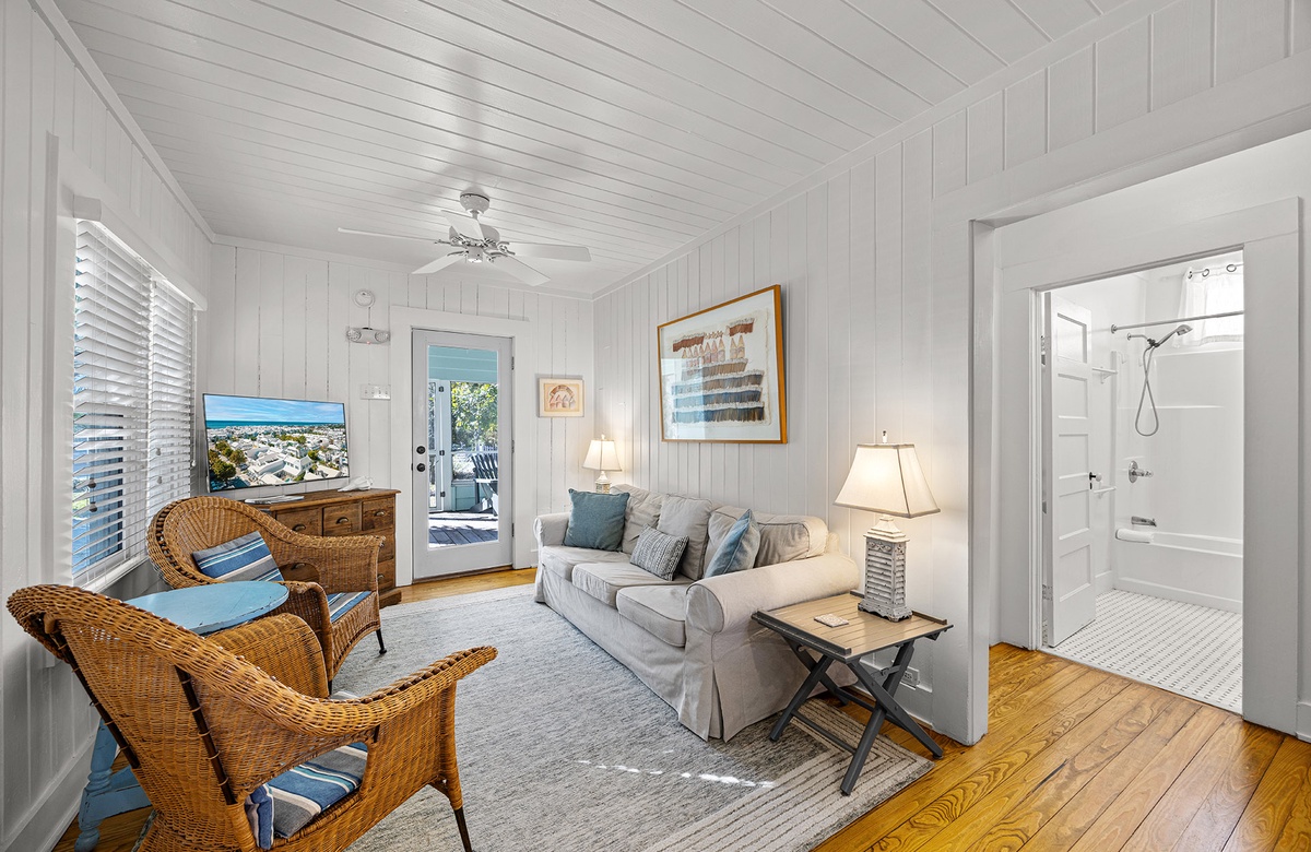 Tucked into the heart of historic Grayton Beach, Sweaty Palms is a classic two-bedroom, one-bath cottage that beautifully blends vintage charm with modern comfort. Perfect for up to four guests, this single-level retreat offers a bright, inviting atmosphere and an unbeatable location just a short stroll from the Gulf and the iconic Red Bar. Inside, crisp shiplap walls, warm hardwood floors, and coastal artwork create a nostalgic beach-cottage vibe, while quartz countertops and stainless-steel appliances in the kitchen add a touch of modern luxury. The cozy living area is ideal for relaxing after a day in the sun, and thoughtful touches like central air conditioning and a washer and dryer make extended stays feel effortless.