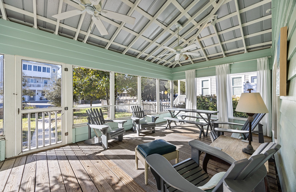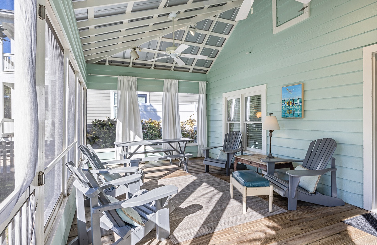 The outdoor spaces capture the relaxed spirit of old Florida living. A screened front porch welcomes quiet mornings with coffee from Black Bear Bread Co., while the sunny back deck—complete with a shaded pergola dining area, grill, and lush grassy yard—offers a peaceful spot for alfresco meals or evening cocktails. Guests especially love the home’s serene setting, tucked away yet just steps from all the charm of Grayton.
