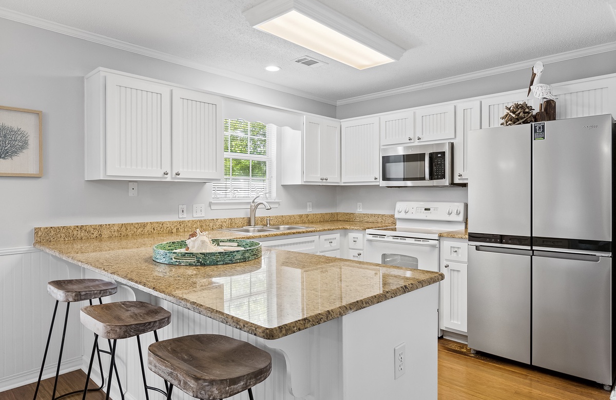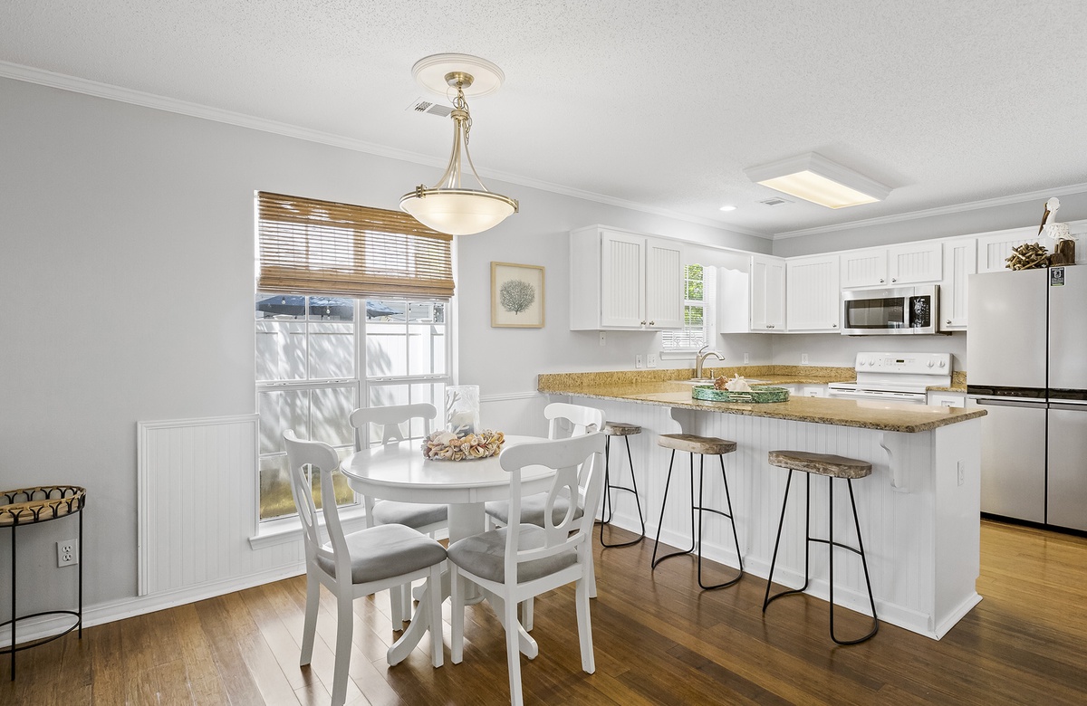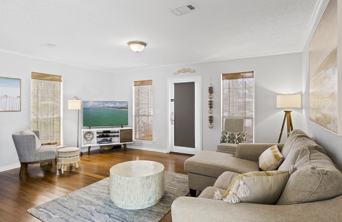 As soon as you arrive at Tipsy Marlin, you will be swept away by the coastal vibe. The Old Floridian-style home is surrounded by palm trees and lush tropical flora. White columns, a breezy balcony, and blue accents contribute to the beachy feel. Step inside, where you will find the first-floor open great room. Caramel-colored hardwood floors extend throughout the space, while large windows filter in ample natural sunlight. The living area features a wraparound couch and an accent chair. The laidback seating ensemble faces a flatscreen TV atop a white credenza. In the dining area, a table and four chairs sit next to a sunny window, creating a casual setting for breakfast, lunch, and dinner. The kitchen has white cabinetry, spacious countertops, and a breakfast bar with stool seating. A full hall bath on this level includes a walk-in shower and serves as a convenient powder room.