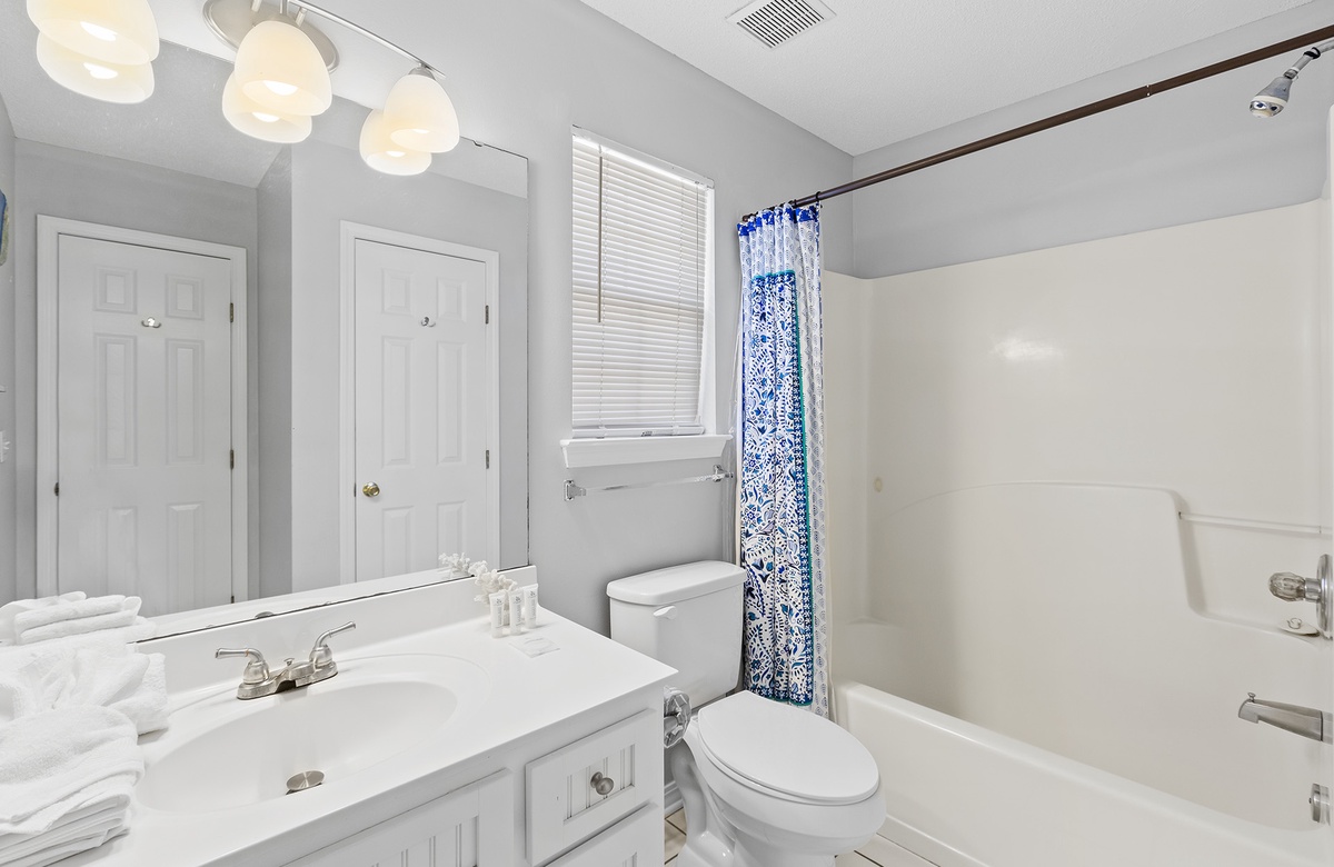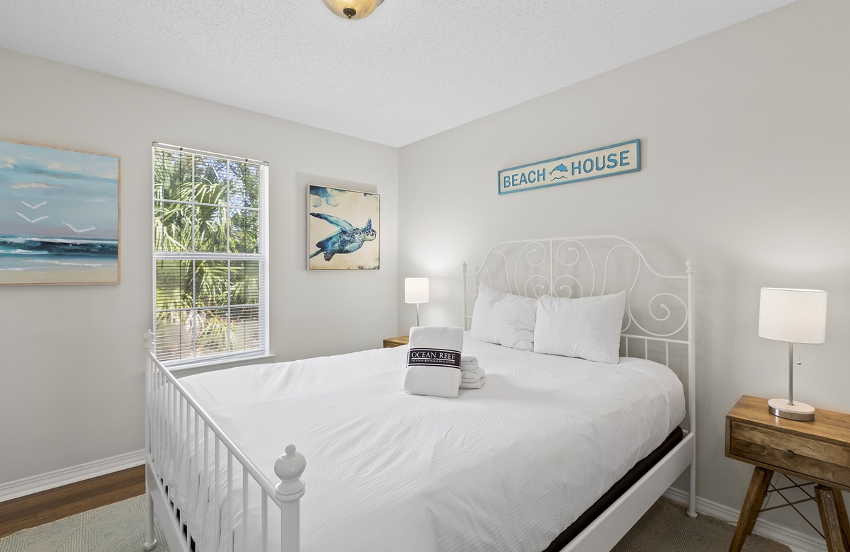 Both bedrooms are located on the second floor. The primary bedroom is bright and sunny, boasting a king-size bed, nautical décor, and a TV. A door accesses a charming balcony. The lovely guest bedroom has a queen-size bed, a sunny window, and sea-inspired art. Both rooms utilize a full hall bath with a tub-shower combination. There is also a Pack-N-Play and highchair provided for the little ones (linens not provided).