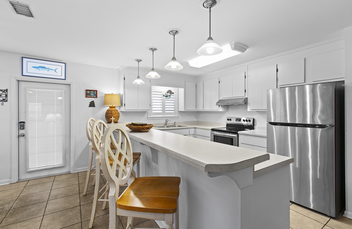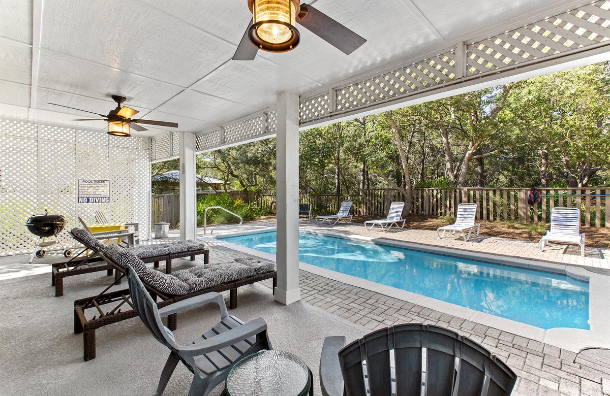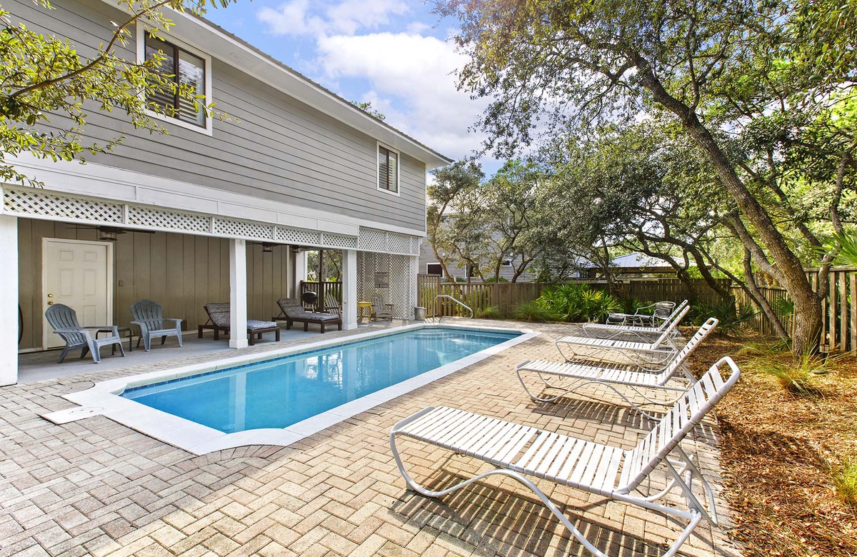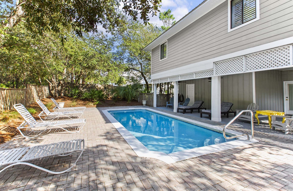 The home has an open floor plan in the main living area, and a large screened porch with plenty of seating so the entire family can enjoy the gulf breezes and listen to the rolling surf, just 250 yards away. Relax by the private pool that offers lots of pool chairs, loungers and a snack table with 4 chairs for outside dining or playing any of the many games available for guest’s to enjoy. In addition, there’s an outside shower for the convenience of rinsing off the beach sand before entering the home or pool.