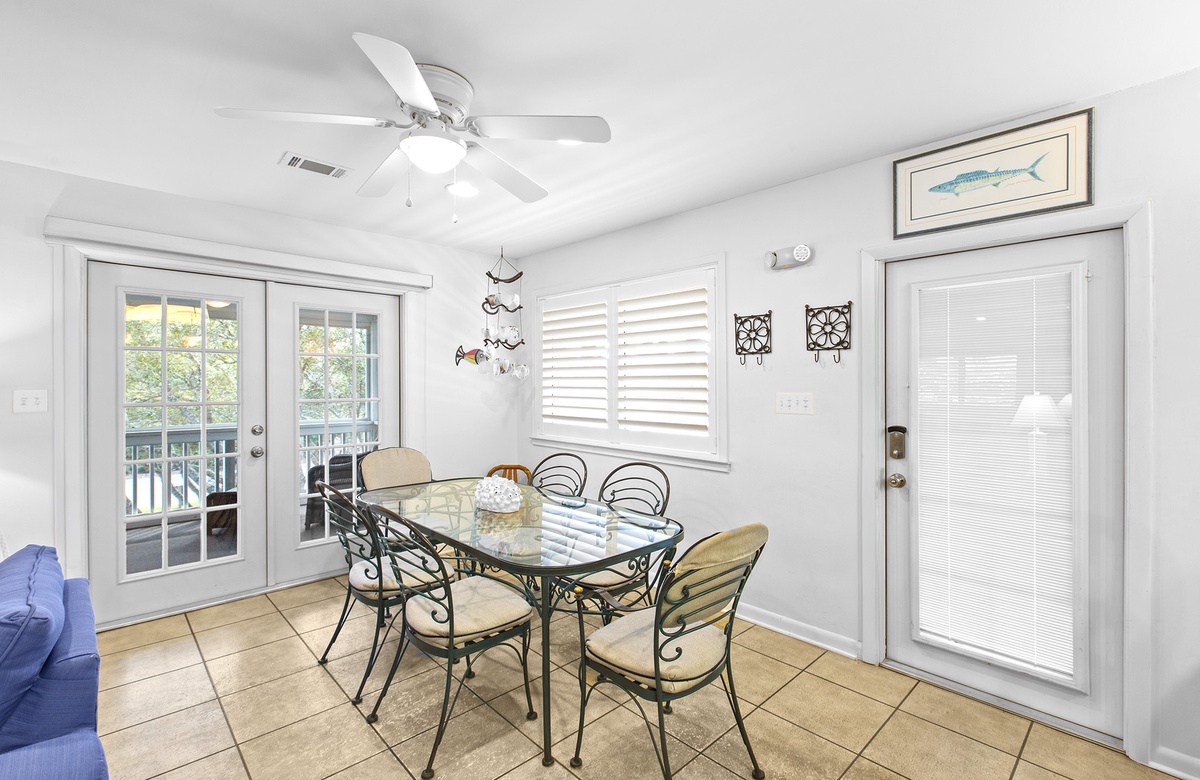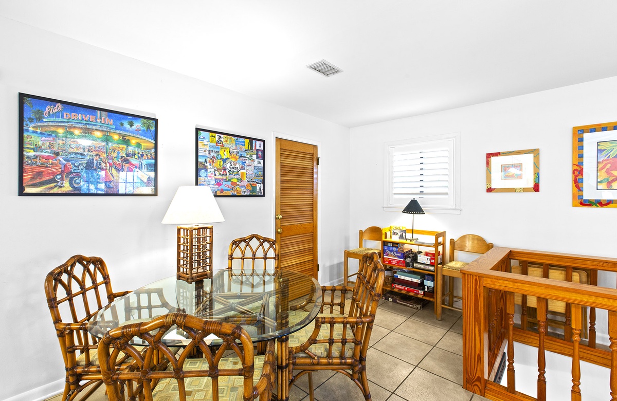 - Dining area with seating for 6, 3 additional bar stools and a small game table with 3 chairs