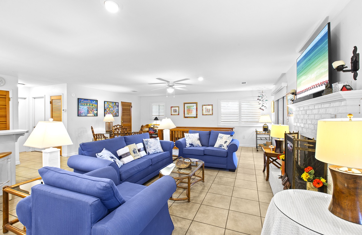 - Living room with queen sofa sleeper and large flat screen TV