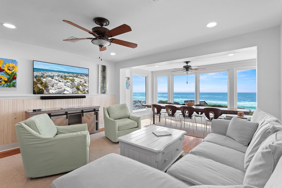 Sea Haunts 3A is an exceptional monthly winter rental in Santa Rosa Beach, offering Gulf-front living with space, privacy, and postcard-worthy views that never get old. This gated South Walton townhome overlooks the sugar-white sands and emerald waters, delivering multiple Gulf views from nearly every level, including a sunroom-style Primary Suite designed for slow mornings and long stays. With four sleeping areas, three full baths, and two half baths, the layout comfortably supports extended winter living—perfect for snowbirds or remote workers who want room to breathe without sacrificing scenery. The professionally styled interior feels bright, calm, and inviting, while the open living and dining areas frame the Gulf through floor-to-ceiling windows, making everyday meals feel like a luxury. Direct boardwalk access leads straight to a private stretch of beach, and shared access to a heated pool and hot tub during select winter periods adds resort-style comfort. Located just south of Scenic 30A and minutes from Gulf Place dining, boutiques, and seasonal events, Sea Haunts 3A blends seclusion with convenience, enhanced by attractive seasonal monthly winter rates.