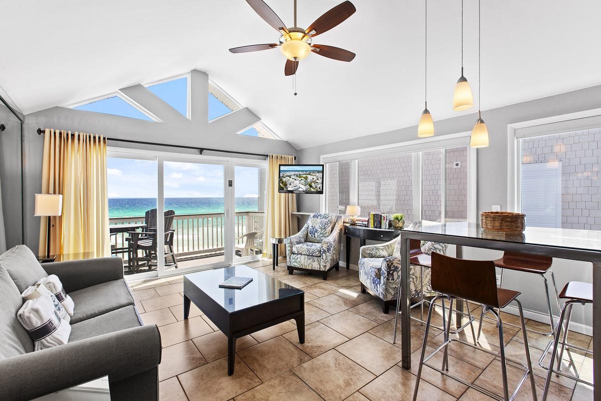 Ramsgate 9 is a beautifully secluded monthly winter rental on 30A, perfect for couples or snowbirds seeking true Gulf-front living in a peaceful, nature-forward setting. Perched high on the dunes in Seacrest Beach, this corner-unit condo offers sweeping, unobstructed Gulf views through a dramatic wall of windows that flood the space with natural light. The remodeled interior features a vaulted ceiling, modern kitchen, and an open living area that flows seamlessly onto a private beachfront balcony—ideal for slow mornings and sunset evenings. With uncrowded winter beaches below and Rosemary Beach just a short drive away, Ramsgate 9 pairs rare seclusion with convenience, made even more appealing by seasonal monthly winter rates.