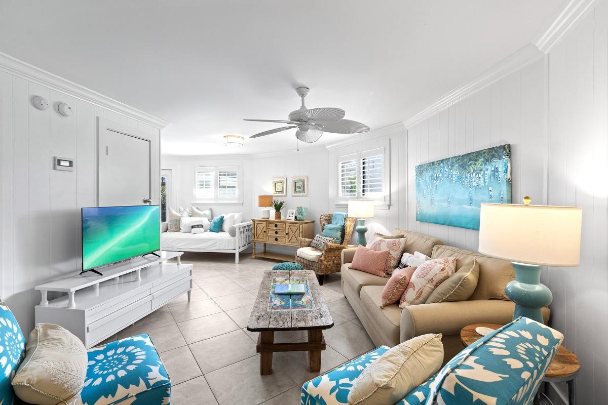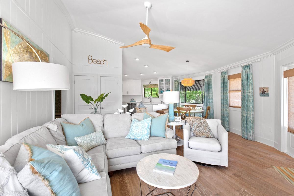 The living room is anchored by a wraparound sectional, perfect for family movie nights or quiet reading sessions. Coastal artwork and driftwood-style finishes add just the right amount of beachy sophistication, while double doors lead out to two breezy sundecks—ideal for morning coffee or evening wine