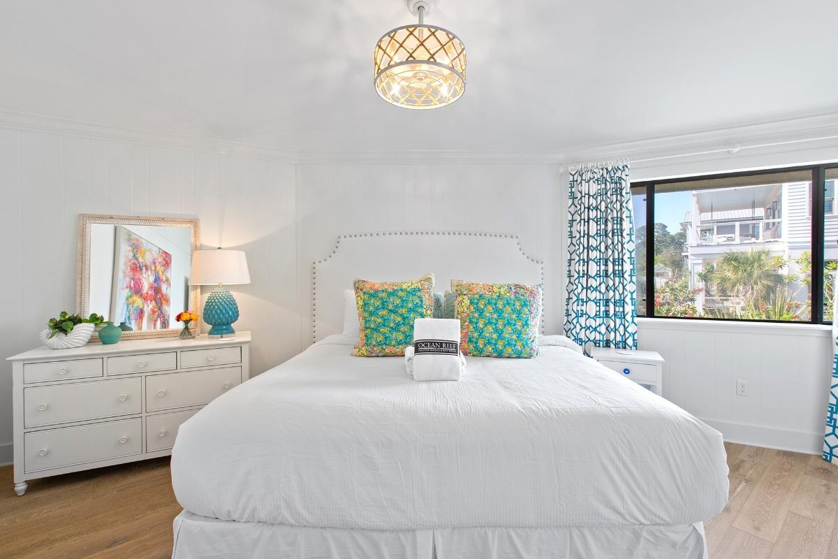 Upstairs, you'll find two thoughtfully designed bedrooms. The primary suite features a king-size bed, cool white furnishings, and a spa-like ensuite bath with veined marble tile and a walk-in shower. The adjacent queen guest bedroom captures plenty of natural light and is just steps from a full hall bath with a tub/shower combo.