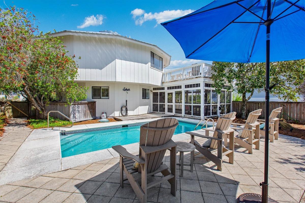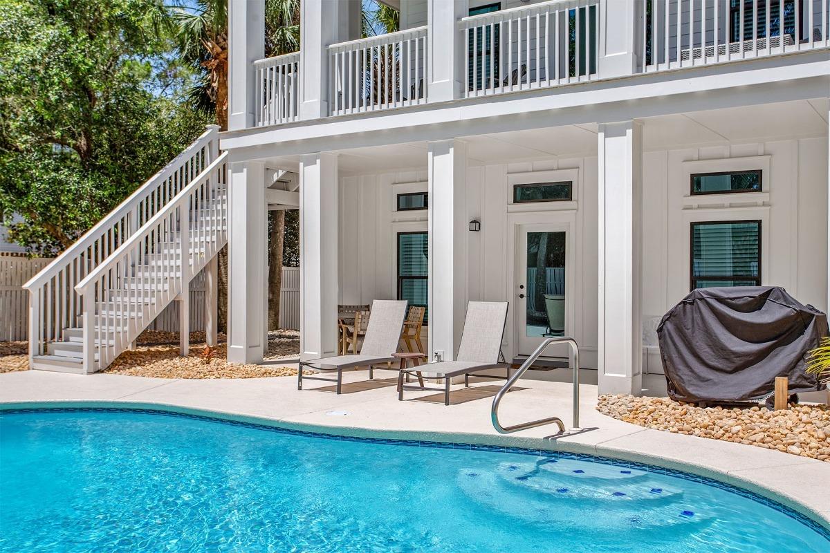 Tucked along a quiet street just south of Scenic 30A, this three-story Santa Rosa Beach retreat invites you to truly unwind. Blessed House features multiple furnished verandas overlooking a lagoon-shaped private pool, along with six bedrooms— including a luxurious top-floor primary suite with a soaking tub and rooftop Gulf-view deck. Whether you’re stretching out in a sun-drenched bedroom, relaxing in the shaded outdoor lounge, or curling up on a breezy porch swing, the entire home feels like an extended invitation to rest. With Gulf Place and the beach just a short stroll or bike ride away, you're never far from the action—but honestly, you might be too relaxed to leave.